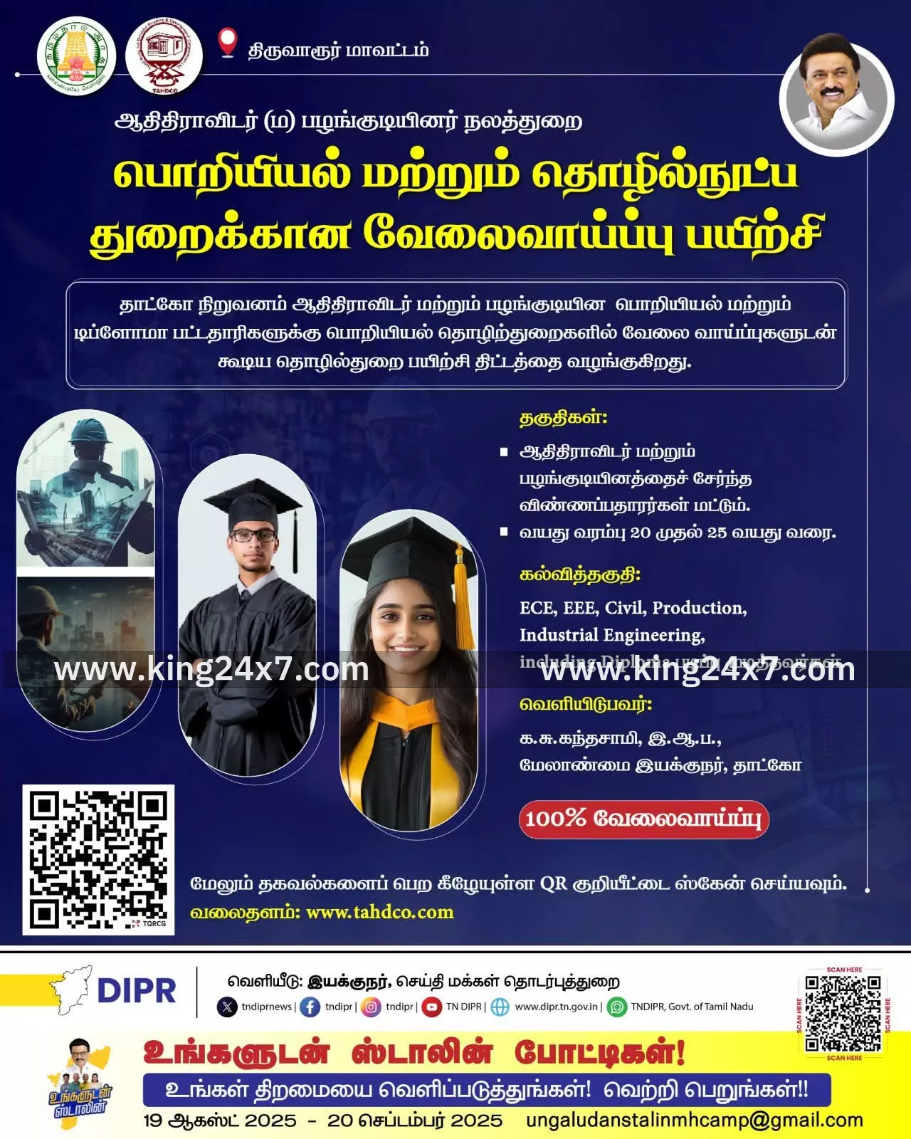 திருவாரூர் மாவட்டதில் தாட்கோ நிறுவனம் ஆதிதிராவிடர் மற்றும் பழங்குடியினர் பொறியியல் மற்றும் டிப்ளமோ பட்டதாரிகளுக்கு பொறியியல் தொழில்நுட்ப துறையில் வேலை வாய்ப்புடன் கூடிய பயிற்சி திட்டத்தை வழங்குகிறது. ஆதிதிராவிடர் மற்றும் பழங்குடியினர் மட்டும் 20 முதல் 25 வயது உடையோர் மட்டும் விண்ணப்பிக்கலாம்,இ.சி. இ, ட்ரிபிள் இ,இண்டஸ்ட்ரியல் இன்ஜினியரிங்,முடித்தவர்கள் விண்ணப்பித்து பயன்பெறலாம். மேலும் அதிக தகவல்கள் பெற www.tahdco.com என்ற இணையதளத்தை பார்வையிடவும்.