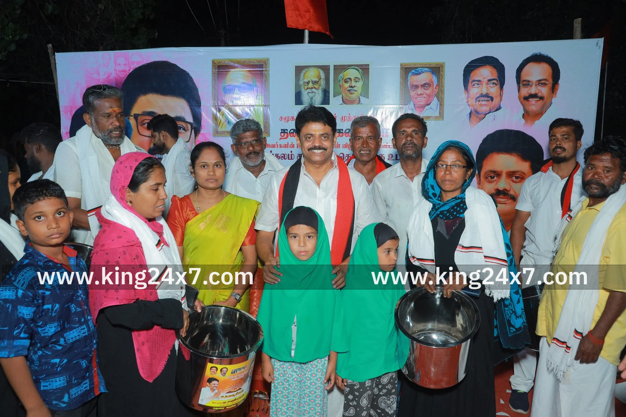 மதுரை திருமங்கலம் தும்மநாயக்கன்பட்டி கிராமத்தில் நேற்று (செப்.2) இரவு மதுரை தெற்கு மாவட்ட திமுக சார்பில் முன்னாள் முதல்வர் கலைஞரின் 102 வது பிறந்தநாள் விழாவை முன்னிட்டு நடைபெற்ற கூட்டத்தில் ரூபாய் 11,50,000 மதிப்பிலான நலத்திட்ட உதவிகளை 940 குடும்பத்தார்களுக்கும், மற்றும் 8க்கு மேற்பட்ட கிரிக்கெட் அணியின் குழுவுக்கும் விளையாட்டு உபகரணங்களை வழங்கியும் 2500 க்கு மேற்பட்ட நபர்களுக்கு அசைவ உணவு வழங்கியும் மாவட்ட செயலாளர் சேடப்பட்டி மணிமாறன் சிறப்புரை ஆற்றினார்.