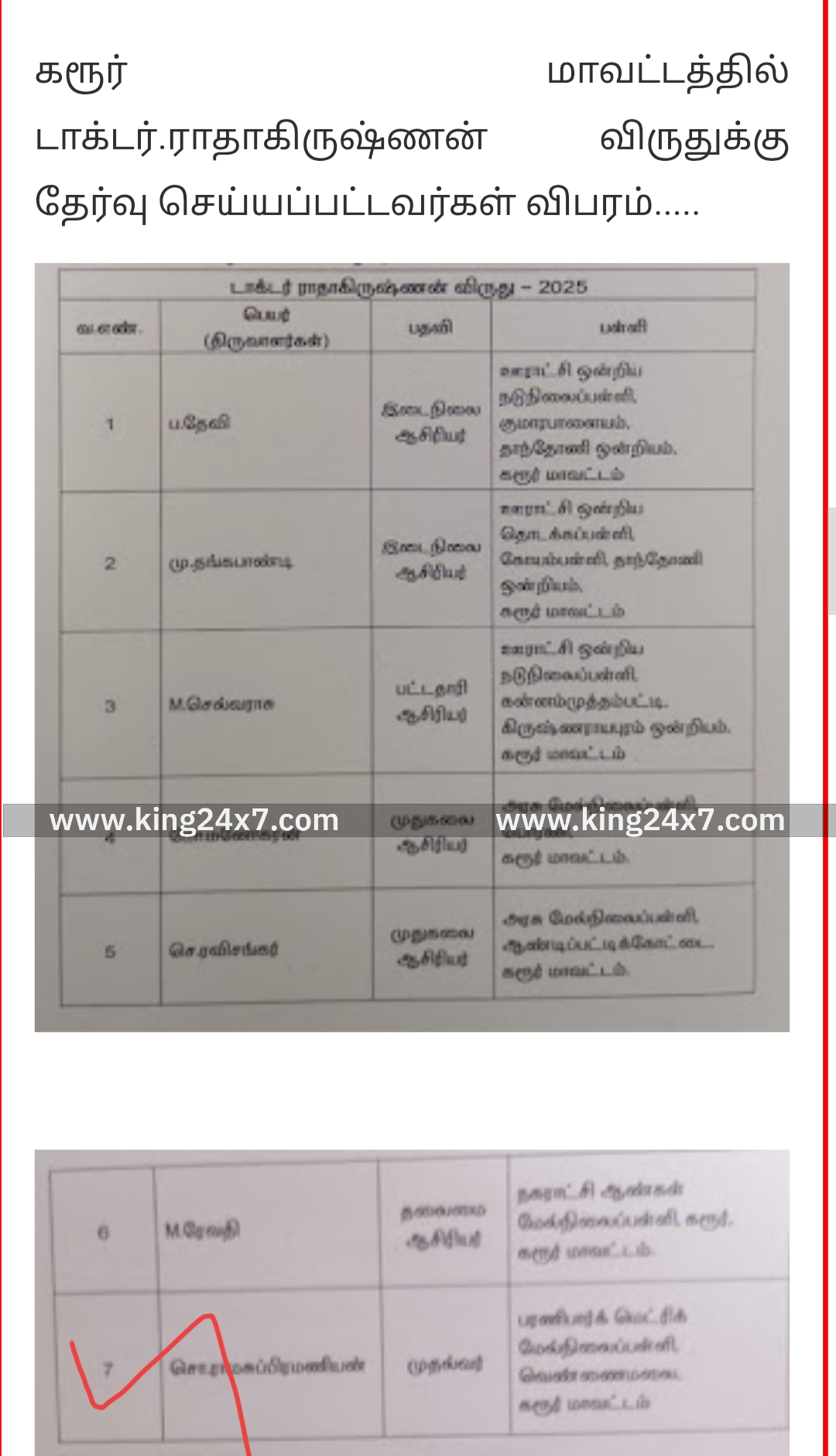 கரூர் - முனைவர் ராமசுப்பிரமணியன் அவர்களுக்கு நல்லாசிரியர் விருது துணை முதலமைச்சர் வழங்கினார். பள்ளிக்கல்வித்துறையில் பள்ளி மற்றும் மாணாக்கர்களின் நலன்களில் தனி அக்கறை கொண்டு சிறப்பாக செயல்படும் ஆசிரியர்களின் பணிகளை பாராட்டி அவர்களை ஊக்கப்படுத்தும் வண்ணம் தமிழக அரசு ஆண்டுதோறும் செப்டம்பா் 5 ஆம் நாள் மாநிலத் தலைநகரான சென்னையில் முதல் அமைச்சரால் & அமைச்சா் பெருமக்களால் சர்வபள்ளி டாக்டர் ராதாகிருஷ்ணன் பெயரில் வழங்கப்படும் நல்லாசிரியர் விருது வழங்கப்பட்டு வருகிறது. அதன் அடிப்படையில் கரூர் மாவட்டத்தில் நல்லாசிரியர் விருது பெறுவதற்கான பட்டியல் தமிழக அரசால் புதன்கிழமை அன்று வெளியிடப்பட்டது. அதில் கரூர் மாவட்டத்தில் 7- ஆசிரியர்கள் தேர்வு செய்யப்பட்டனர். இதில் வெண்ணைமலை பரணி பார்க் கல்வி குழுமத்தில் முதன்மை முதல்வராக பணியாற்றி வரும் முனைவர் ராமசுப்பிரமணியன் தேர்வு செய்யப்பட்டார். இன்று சென்னையில் நடைபெற்ற நல்லாசிரியர் விருது வழங்கும் விழாவில் துணை முதலமைச்சர் உதயநிதி ஸ்டாலின் முனைவர் ராமசுப்பிரமணியன் அவர்களுக்கு நல்லாசிரியர் விருது வழங்கி வாழ்த்து தெரிவித்தார். இதனைத் தொடர்ந்து பள்ளிக்கல்வித்துறை மற்றும் அவருடன் தொடர்பில் உள்ள அனைவரும் அவருக்கு சமூக வலைதளத்திலும் அலைபேசியிலும் வாழ்த்துக்களை தெரிவித்து வருகின்றனர்.