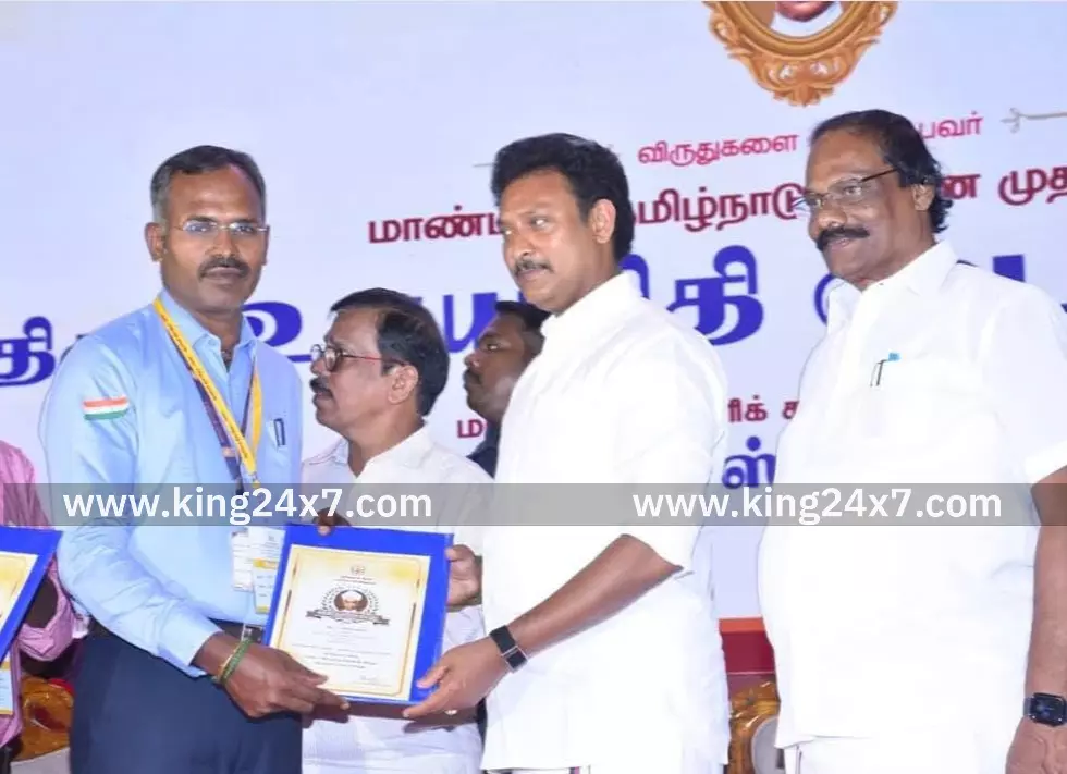 காவேரிப்பட்டிணம் அருகே தனியார் பள்ளி முதல்வருக்கு இராதாகிருஷ்ணன் விருதை வழங்கிய அமைச்சர்.