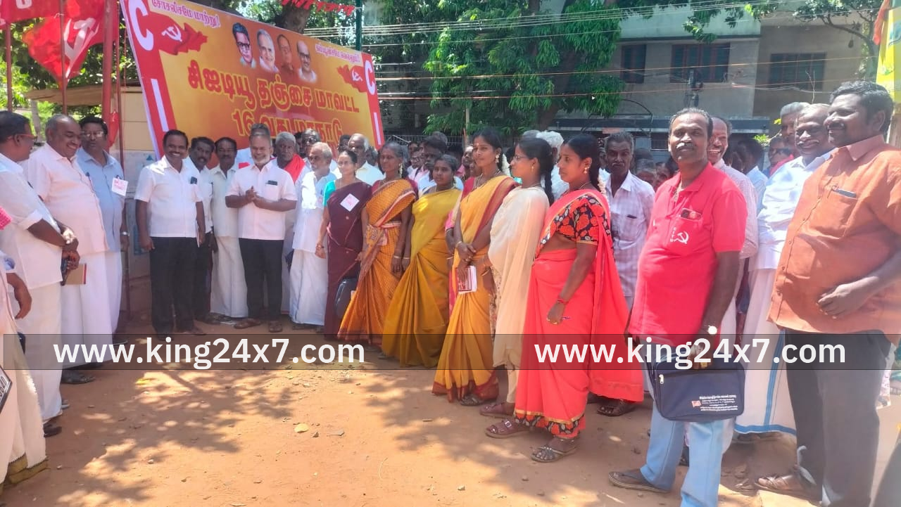 இந்திய தொழிற்சங்க மையம், (சிஐடியு) தஞ்சை மாவட்ட 16 ஆவது மாநாடு செப்டம்பர் 16, 17 (சனி, ஞாயிறு) ஆகிய இரு தினங்கள் தஞ்சாவூர் ராமநாதன் ரவுண்டானா நான்சி மஹாலில், தோழர் சா.ஜீவபாரதி நினைவரங்கம், தோழர்கள் ஏ.சி.தூயமணி, டி.ஏ.சந்திரசேகர் நினைவு நுழைவு வாயிலில் நடைபெற்றது. முதல்நாள் சனிக்கிழமை மாலை, சிவகங்கை பூங்காவிலிருந்து பேரணி புறப்பட்டு, பனகல் கட்டிடம் அருகில், சுதந்திரப் போராட்ட வீரர்கள் தோழர்கள் என்.சங்கரையா, வி.எஸ். அச்சுதானந்தன் நினைவுத் திடலில் பொதுக்கூட்டம் நடைபெற்றது. சிஐடியு மாவட்டச் செயலாளர் சி.ஜெயபால் தலைமை வகித்தார். வரவேற்புக்குழு செயலாளர் து.கோவிந்தராஜூ வரவேற்றார். சிஐடியு மாநில துணைப்பொதுச் செயலாளர் கே.திருச்செல்வன், மாநில துணைத் தலைவர் எம்.சந்திரன், வரவேற்புக்குழு துணைத் தலைவர் சின்னை.பாண்டியன் ஆகியோர் சிறப்புரையாற்றினர். மாவட்டத் தலைவர் ம.கண்ணன், வரவேற்புக்குழு தலைவர் எஸ்.செல்வராஜ், துணைத் தலைவர்கள் என்.குருசாமி, எம்.வடிவேலன், மாவட்ட துணைச் செயலாளர்கள் கே.அன்பு, சா.செங்குட்டுவன், மாவட்ட நிர்வாகிகள் என்.பி.நாகேந்திரன், இ.டி.எஸ்.மூர்த்தி, த.முருகேசன், கே.வீரையன், ஜி.மணிமாறன், ஆர்.சேகர், பி.ஜேசுதாஸ், பி.பார்த்தசாரதி, சாய்.சித்ரா, பி.காணிக்கை ராஜ், எஸ்.மில்லர் பிரபு, கே..பாலமுருகன், ஏ.ராஜா, ஆர்.பவானி உள்ளிட்டோர் கலந்து கொண்டனர். நிறைவாக வரவேற்புக்குழு பொருளாளர் பி.என்.பேர் நீதி ஆழ்வார் நன்றி கூறினார். பிரதிநிதிகள் மாநாடு ஞாயிற்றுக்கிழமை பிரதிநிதிகள் மாநாடு நடைபெற்றது. மாவட்டத் தலைவர் ம.கண்ணன் தலைமை வகித்தார். மாநிலக்குழு உறுப்பினர் என்.பி.நாகேந்திரன் கொடியேற்றினார். வரவேற்புக்குழு தலைவர் எஸ்.செல்வராஜ் வரவேற்றார். மாவட்ட துணைத் தலைவர் கே.வீரையன் அஞ்சலி தீர்மானம் வாசித்தார். மாநில துணைத் தலைவர் எம்.சந்திரன் துவக்கவுரையாற்றினார். மாவட்டச் செயலாளர் சி.ஜெயபால் வேலை, ஸ்தாபன அறிக்கை வாசித்தார். மாவட்டப் பொருளாளர் பி.என்.பேர் நீதி ஆழ்வார் வரவு - செலவு அறிக்கை வாசித்தார். தமிழ்நாடு விவசாயிகள் சங்க மாவட்டச் செயலாளர் என்.வி.கண்ணன், அகில இந்திய விவசாயத் தொழிலாளர்கள் சங்க மாவட்டச் செயலாளர் ஆர். வாசு ஆகியோர் வாழ்த்திப் பேசினார். நிர்வாகிகள் தேர்வு அறிக்கை, விவாதம், தொகுப்புரைக்கு பிறகு மாநாட்டில் புதிய நிர்வாகிகள் தேர்வு செய்யப்பட்டனர். மாவட்டச் செயலாளராக ம.கண்ணன், மாவட்டத் தலைவராக சி.ஜெயபால், மாவட்டப்பொருளாளராக பி.என்.பேர்நீதி ஆழ்வார் மற்றும் 21 நிர்வாகிகளை உள்ளடக்கிய 45 பேர் கொண்ட மாவட்டக்குழு தேர்வு செய்யப்பட்டது. மேலும், மாநில மாநாட்டு பிரதிநிதிகள் தேர்வு செய்யப்பட்டனர். மாநில துணைப் பொதுச் செயலாளர் க