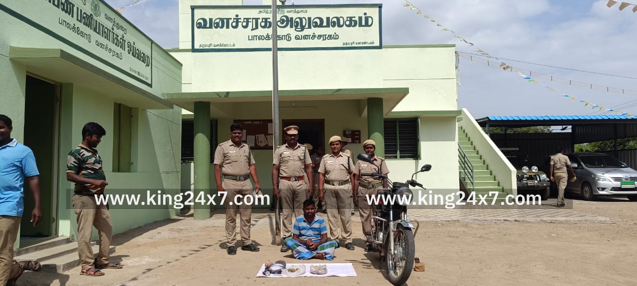 தர்மபுரி மாவட்டம் இன்று பாலக்கோடு அருகே தாசன்பெயில் கிராம வன பகுதியில் வன விலங்குகளை வேட்டையாடுவதாக பொதுமக்களின் புகாரின் பேரில் பாலக்கோடு வனசரக அலுவலர் கார்த்திகேயன் தலைமையிலான வனத்துறையினர், இன்று சொக்கன் கொட்டாய் காப்புகாடு பகுதியில் கண்காணிப்பு பணியில் ஈடுபட்டிருந்தார். அப்போது அப்பகுதியில் மின்வேலி அமைத்து வனவிலங்குகளை வேட்டையாட முயன்ற ஒருவரை பிடித்து விசாரித்ததில் தாசன்பொயில் கிராமத்தை சேர்ந்த கணேசன் என்பதும், வன விலங்குகளை வேட்டையாடி வருவதும் தெரியவந்தது. அதனை தொடர்ந்து அவரை கைது செய்த வனதுறையினர் மாவட்ட வன அலுவலர் ராஜங்கம் பரிந்துரையின் படி தலா 1.50லட்சம் ரூபாய் அபராதம் விதித்தனர். வன விலங்குகளை வேட்டையாடுபவர்கள் மீது கடும் நடவடிக்கை எடுக்கப்படும் என பாலக்கோடு வனசரக அலுவலர் கார்த்திகேயன் எச்சரித்துள்ளார்
