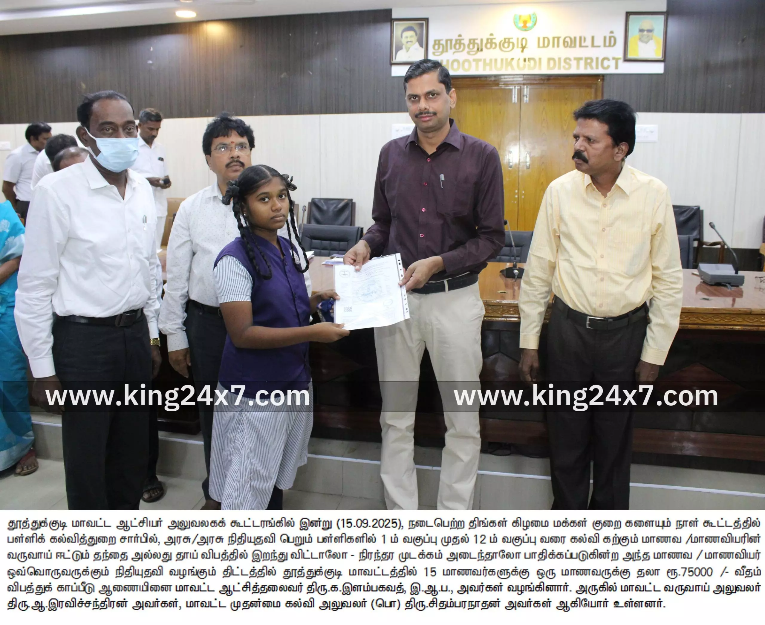 தூத்துக்குடி மாவட்ட ஆட்சியர் மாணவர்களுக்கு நிதியுதவி வழங்கினார் தூத்துக்குடி மாவட்ட ஆட்சியர் அலுவலகக் கூட்டரங்கில் இன்று (15.09.2025) நடைபெற்ற திங்கள் கிழமை மக்கள் குறை தீர்க்கும் நாள் கூட்டத்தில், பள்ளிக் கல்வித்துறை சார்பில் ஒரு சிறப்பு திட்டம் செயல்படுத்தப்பட்டது. அரசு மற்றும் அரசு நிதியுதவி பெறும் பள்ளிகளில் 1-ம் வகுப்பு முதல் 12-ம் வகுப்பு வரை கல்வி கற்கும் மாணவர்களின் வருவாய் ஈட்டும் தந்தை அல்லது தாய் விபத்தில் உயிரிழந்தாலோ, நிரந்தர முடக்கம் அடைந்தாலோ, அந்த மாணவர்கள் பாதிக்கப்படாமல் கல்வியைத் தொடர உதவும் வகையில் நிதியுதவி வழங்கப்படுகிறது. அந்த திட்டத்தின் கீழ், இன்று தூத்துக்குடி மாவட்டத்தில் 15 மாணவர்களுக்கு, ஒருவருக்கு ரூ.75,000/- வீதம் விபத்து காப்பீடு நிதியுதவி ஆணையை மாவட்ட ஆட்சித்தலைவர் திரு. க. இளம்பகவத், இ.ஆ.ப. அவர்கள் வழங்கினார். இவ்விழாவில் மாவட்ட வருவாய் அலுவலர் திரு. ஆ. இரவிச்சந்திரன், மாவட்ட முதன்மை கல்வி அலுவலர் (பொ) திரு. சிதம்பரநாதன் ஆகியோர் உடன் கலந்து கொண்டனர்.