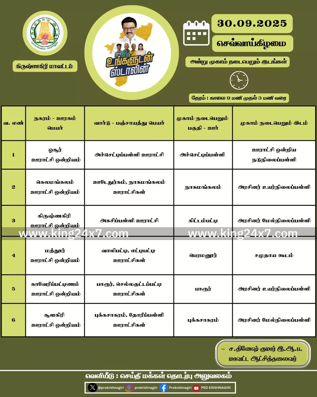 கிருஷ்ணகிரி மாவட்டம், போச்சம்பள்ளி அருகே உள்ள செல்லகுட்டப்பட்டி, பாரூர் ஊராட்சிகளுக்கான உங்களுடன் ஸ்டாலின் நாளை முகாம் (செப்டம்பர்30), காலை 9.00 மணி முதல் மாலை 3.00 மணி வரை பாரூர் அரசு உயர்நிலைப்பள்ளியில் நடைபெறுகிறது. இந்த முகாமில் 15 அரசுத்துறைகளின் சார்பில் நடைபெறுகிறது. எனவே, மக்கள் முகாமில் கலந்துகொண்டு தங்களின் குறைகளை மனு அளித்து பயன் பெறலாம் என்று தெரிவிக்கப்பட்டுள்ளது.