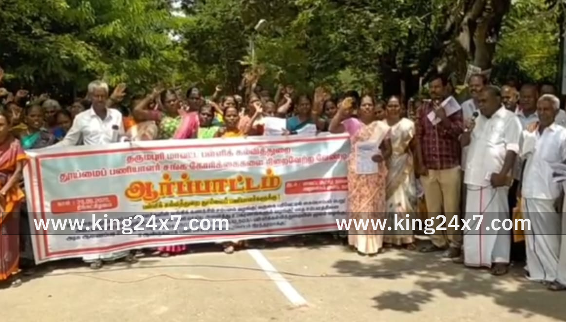 தருமபுரி பள்ளி கல்வி தூய்மைப் பணியாளர் சங்கம். மாவட்ட ஆட்சித் தலைவர் அலுவலகம் அருகில் நேற்று திங்கட்கிழமை மாலை ஆர்ப்பாட்டம். தருமபுரி கல்வி மாவட்டத்தில் அரசு பள்ளிகளான தொடக்கப் பள்ளி, நடுநிலைப்பள்ளி, உயர்நிலைப்பள்ளி,மேல்நிலைப்பள்ளிகளில் பணி செய்யும் தூய்மைப் பணியாளர்களுக்கு மாதா மாதம் சம்பளம் பணியாளர்களின் வங்கி கணக்கில் செலுத்த வேண்டியும், அடையாள அட்டை வழங்க, தினமும் வருகை பதிவேட்டில் கையொப்பம் பெற,தூய்மை பணி செய்ய உபகரணங்கள் வழங்க வேண்டும் என்பது உள்ளிட்ட கோரிக்கைகளை வலியுறுத்தி ஆர்ப்பாட்டம் நடந்தது.