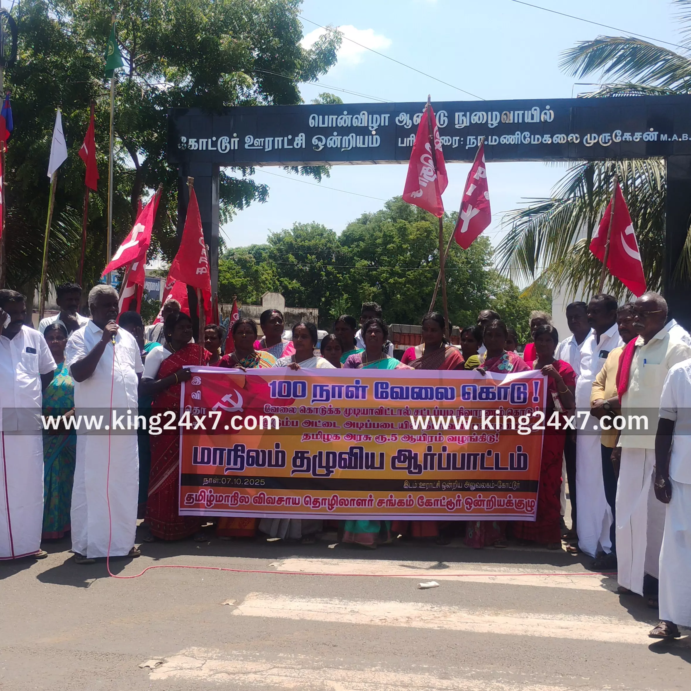 இந்திய கம்யூனிஸ்ட் கட்சியின் தமிழ் மாநில விவசாய தொழிலாளர் சங்கம் சார்பில் தமிழகம் முழுவதும் பல்வேறு கோரிக்கைகளை வலியுறுத்தி ஆர்ப்பாட்டம் நடைபெற்று வருகிறது. இதன் ஒரு பகுதியாக திருவாரூர் மாவட்டம் மன்னார்குடி அருகே கோட்டூரில் ஆர்ப்பாட்டம் நடைபெற்றது.கோட்டூர் பேருந்து நிலையத்தில் இருந்து பெண்கள் விவசாயிகள் இந்திய கம்யூனிஸ்ட் கட்சியினர் ஏராளமானோர் ஊராட்சி ஒன்றிய அலுவலகம் வரை ஊர்வலமாக சென்றனர். அங்கு ஊராட்சி ஒன்றிய அலுவலகம் எதிரே நடைபெற்ற ஆர்ப்பாட்டத்தில் கிராம பகுதிகளில் 100 நாள் வேலை வழங்க வேண்டும்,வேலை வழங்க முடியாவிட்டால் நிவாரணம் வழங்க வேண்டும். 100 நாள் வேலையை 200 நாட்கள் வழங்க வேண்டும், நாள் ஒன்றுக்கு 800 ரூபாய் சம்பளம் வழங்க வேண்டும், 100 நாள் திட்ட பணியாளர்களுக்கு குடும்ப அட்டை அடிப்படையில் தீபாவளி பண்டிகைக்கு தமிழக அரசு 5 ஆயிரம் ரூபாய் வழங்க வேண்டும் என்பன உள்ளிட்ட கோரிக்கைகளை நிறைவேற்ற வலியுறுத்தி கண்டன கோஷங்களை எழுப்பி ஆர்ப்பாட்டம் நடத்தினர்.