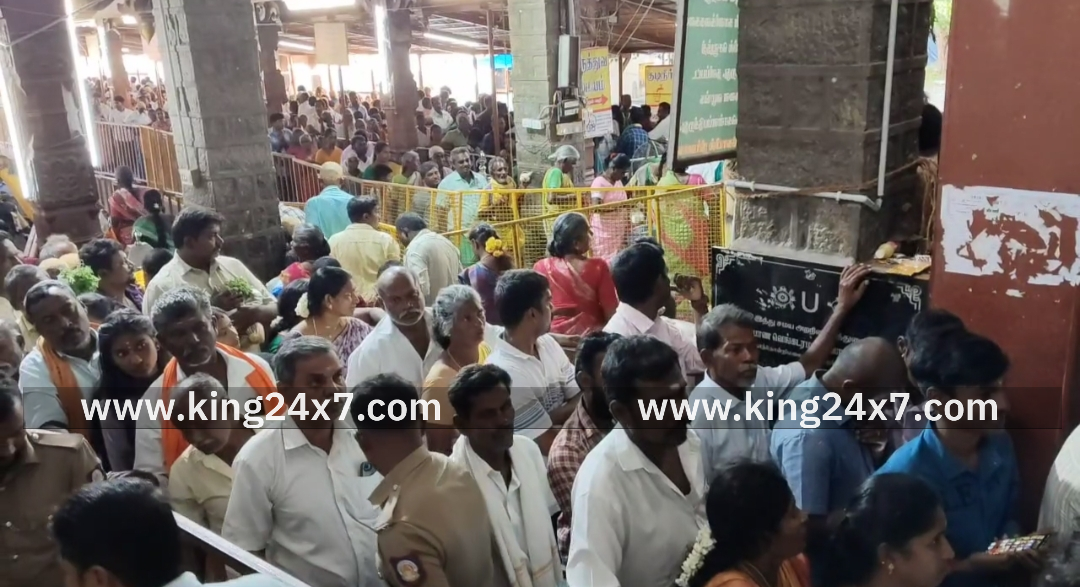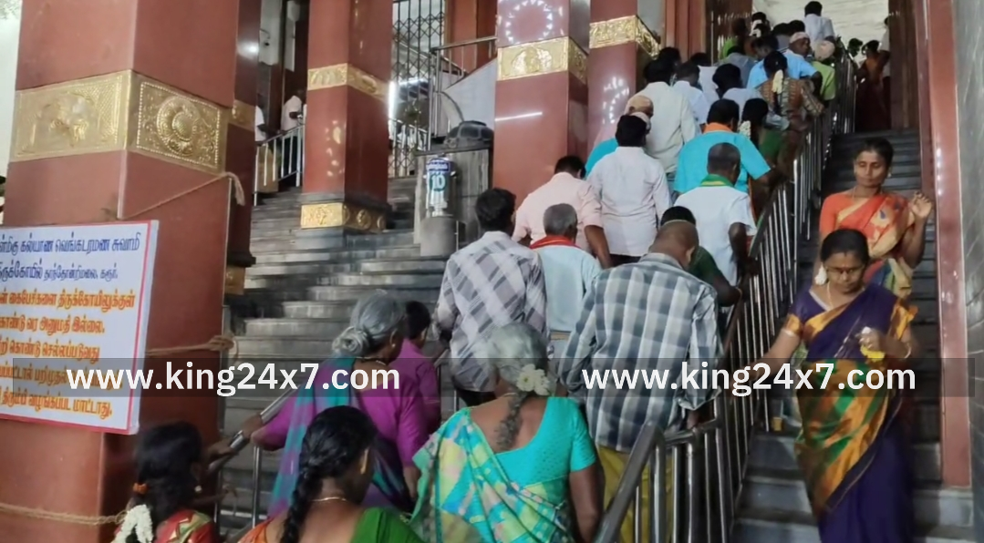 கரூர் அருள்மிகு கல்யாணம் வெங்கட ரமண சுவாமி திருக்கோவிலில் ஏராளமான பக்தர்கள் சாமி தரிசனம். புரட்டாசி மாதத்தில் ஒவ்வொரு சனிக்கிழமையும் பெருமாள் கோவில்களில் சிறப்பு அபிஷேகம் மற்றும் பூஜை நடைபெறுவது வழக்கம். கரூரில் பிரசித்தி பெற்ற தென் திருப்பதி என்று அழைக்கப்படும் அருள்மிகு கல்யாண வெங்கட ரமண சுவாமி திருக்கோவிலில் புரட்டாசி மாதத்தில் ஒவ்வொரு சனிக்கிழமையும் பக்தர்கள் ஏராளமானோர் சாமி தரிசனம் செய்வது வழக்கம். இன்று நான்காவது புரட்டாசி சனிக்கிழமை முன்னிட்டு கரூர் சுற்றுவட்டார பகுதியை சேர்ந்த ஏராளமான பக்தர்கள் இன்று தாந்தோணி மலை கல்யாண வெங்கட ரமண சுவாமி திருக்கோவில் சாமி தரிசனம் செய்ய வந்தனர். கூட்டம் அதிகமாக இருந்தால் காவல்துறையினர் பாதுகாப்பு பணியில் ஈடுபடுத்தப்பட்டுள்ளனர்.