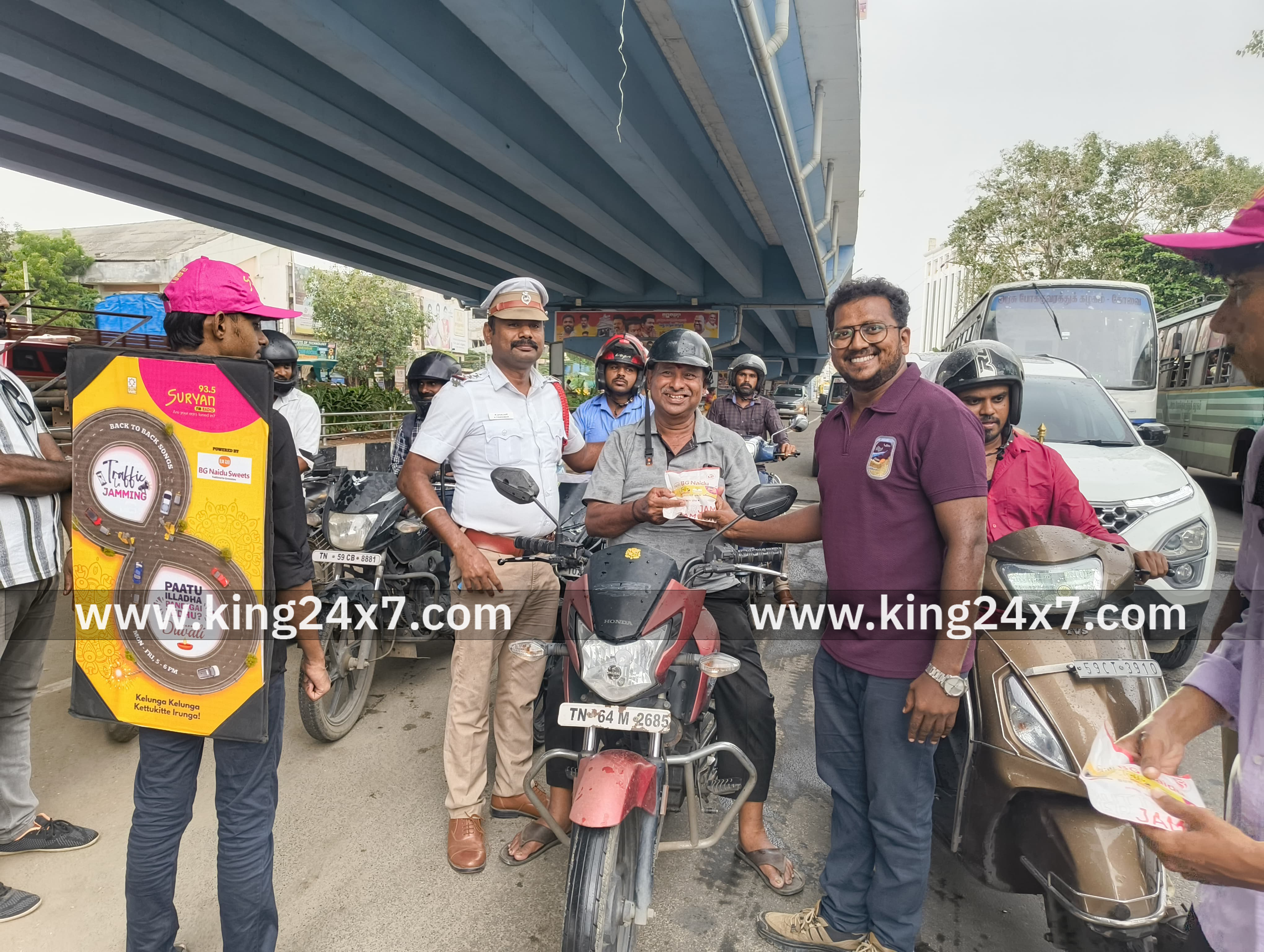 மதுரை மாநகர். காளவாசல் பகுதியில் இன்று (அக்.11)போக்குவரத்து விதிகளை முறையாக பின்பற்றி, தலைக்கவசம், சீட் பெல்ட், அணிந்து வந்த வாகன ஓட்டிகளை ஊக்குவிக்கும் வகையில் அவர்களுக்கு மதுரை மாநகர் காவல் துறையுடன் சூரியன் FM இணைந்து இனிப்புகள் வழங்கினர்கள். இந்நிகழ்வில் திலகர் திடல் போக்குவரத்து காவல் ஆய்வாளர் தங்கமணி,சார்பு ஆய்வாளர் சந்தனகுமார்,, சூரியன் FM நிறுவனத்தின் ரூபன் ஆகியோர் கலந்து கொண்டனர்.