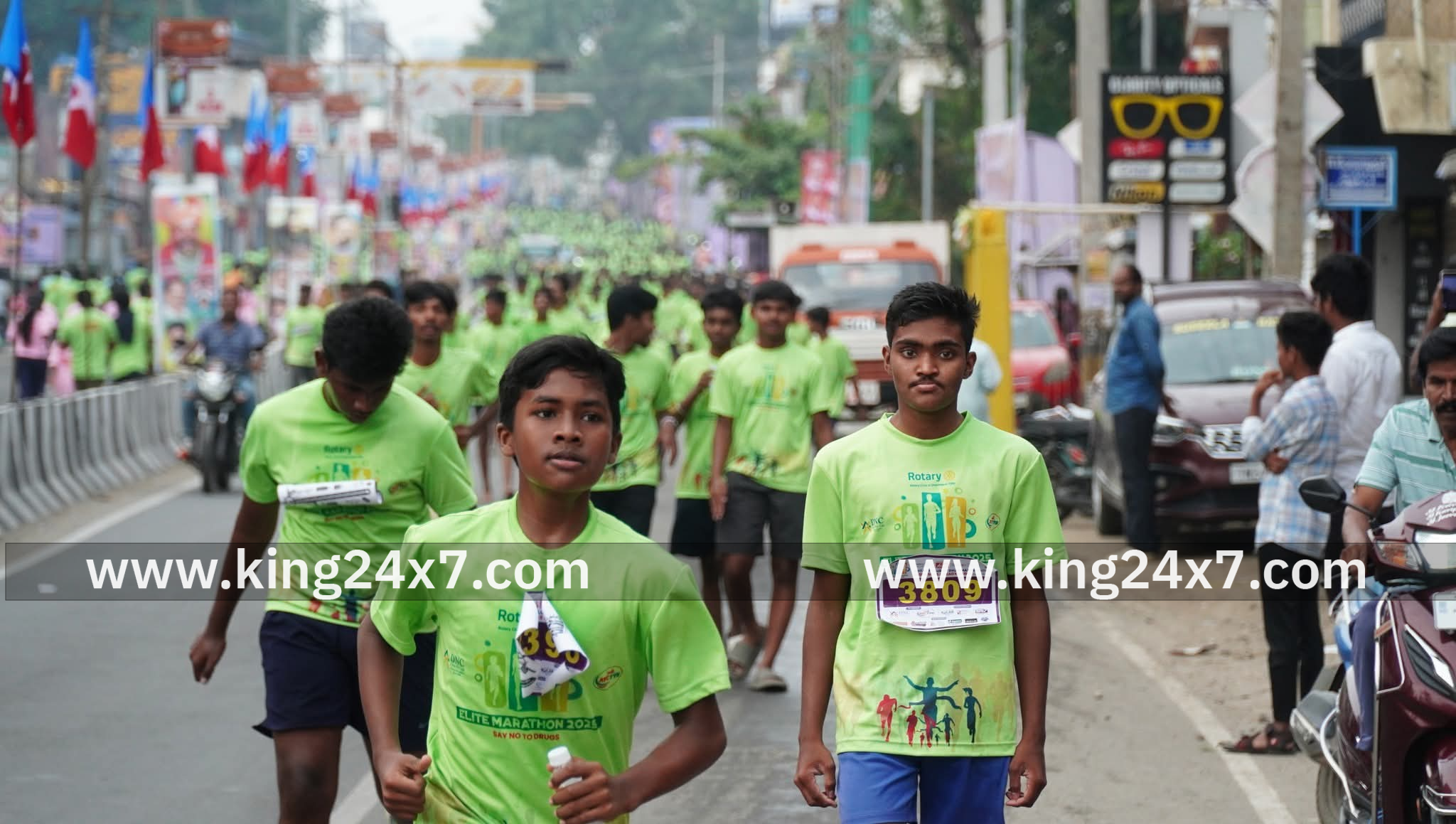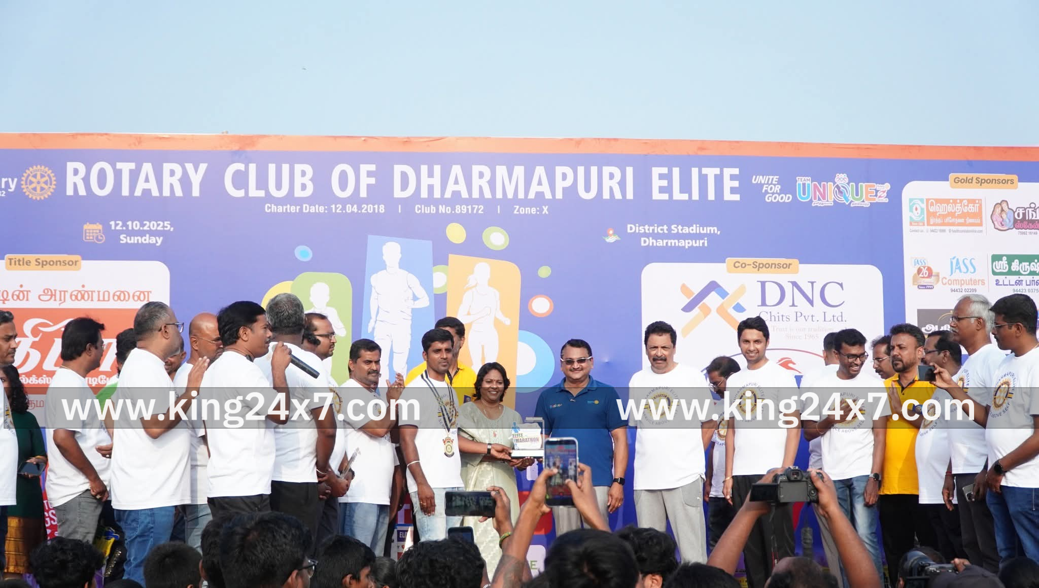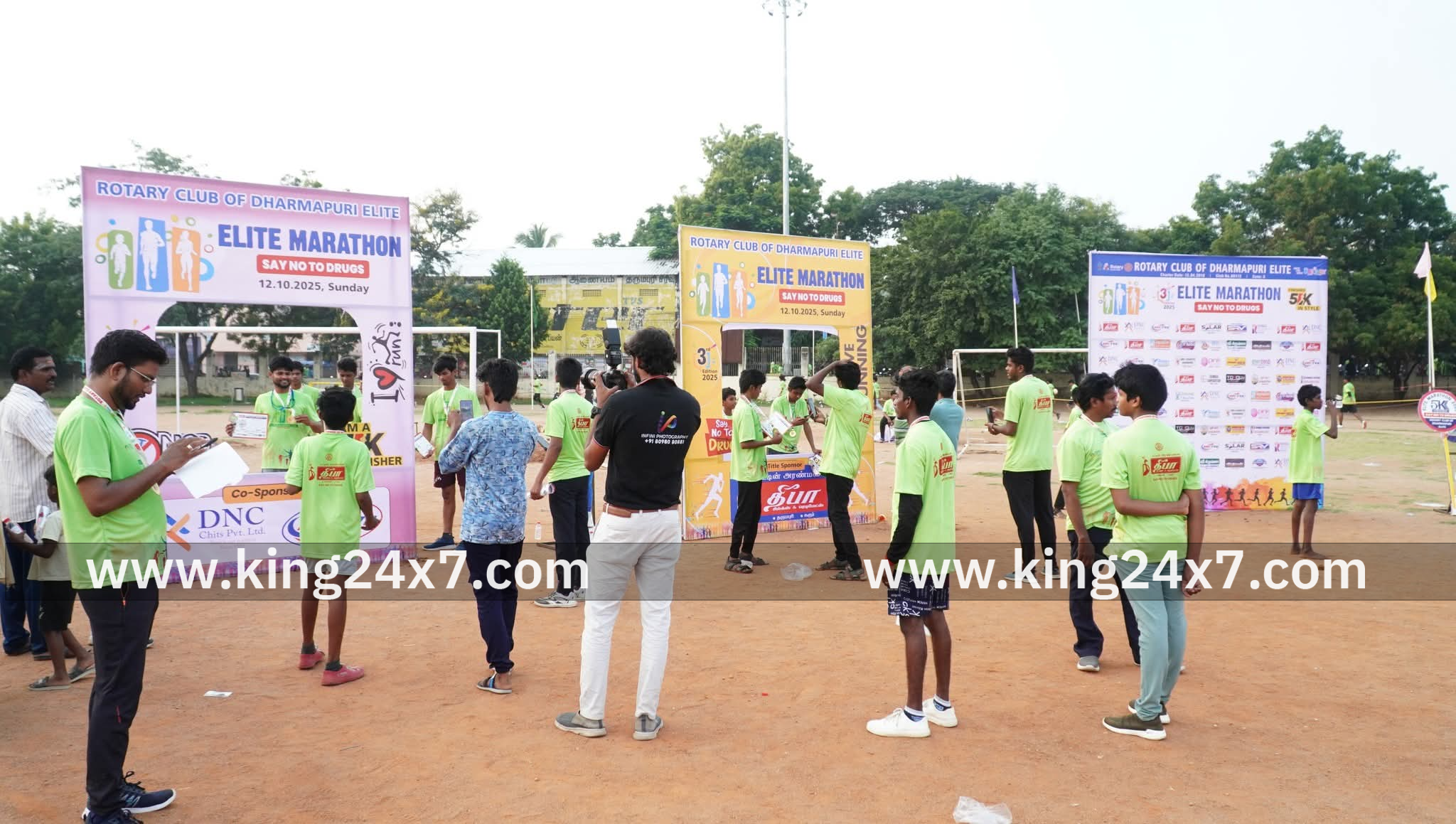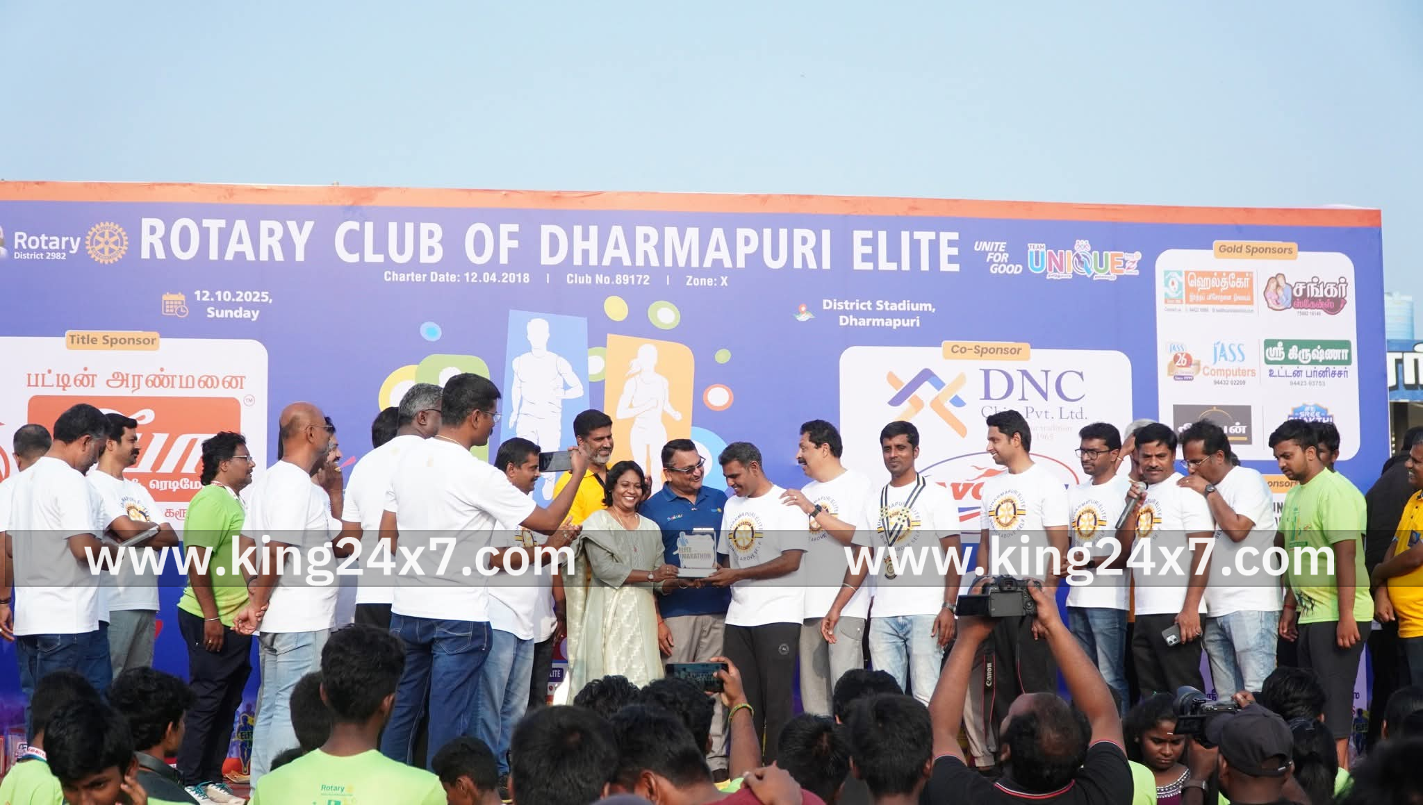 தர்மபுரி எலைட் ரோட்டரி சங்கம் மற்றும் தனியார் நிறுவனங்கள் இணைந்து நடத்திய போதைப் பொருட்களுக்கு எதிரான விழிப்புணர்வு மாரத்தான் போட்டி தர்மபுரியில் இன்று காலை 8 மணி அளவில் நடைபெற்றது. மாவட்ட விளையாட்டு அரங்கில் இருந்து தொடங்கிய இந்த மாரத்தான் போட்டி தொடக்க விழாவுக்கு ஸ்ரீ விஜய் வித்யாலயா கல்வி நிறுவனங்களின் தலைவர் டி.என்.சி. மணிவண்ணன் தலைமை தாங்கினார். ரோட்டரி கவர்னர் சிவசுந்தரம், துணை கவர்னர் பிரதீப் குமார் ஆகியோர் முன்னிலை வகித்தனர். மாரத்தான் ஒருங்கிணைப்பாளர் விக்ரமன் வரவேற்றார். இந்த போட்டிகளை துணை போலீஸ் சூப்பிரண்டு சிவராமன் கொடி அசைத்து தொடங்கி வைத்தார். இந்த போட்டிகள் ஆண்கள், பெண்கள் மற்றும் மாற்றுத்திறனாளிகளுக்கு தனி தனியாக நடைபெற்றது. 5 கிலோமீட்டர் தூரம் நடைபெற்ற இந்த போட்டிகளில் ஆயிரக்கணக்கான மாணவ, மாணவிகள், வீரர், வீராங்கனைகள் ஆர்வத்துடன் கலந்துகொண்டு உற்சாகமாக ஓட்டத்தில் கலந்து கொண்டனர். இதேபோல் மாற்றுத்திறனாளிகளுக்கும் குறிப்பிட்ட எல்லை வகுக்கப்பட்டு போட்டி நடைபெற்றது. இதில் மாற்றுத்திறனாளிகள் ஆர்வத்துடன் கலந்து கொண்டனர். இந்த போட்டிகளில் வெற்றி பெற்றவர்களுக்கு பரிசு மற்றும் சான்றிதழ்கள் வழங்கும் விழா மாவட்ட விளையாட்டு அரங்கில் நடைபெற்றது. இந்த நிகழ்ச்சியில் மாவட்ட விளையாட்டு அலுவலர் சாந்தி, தீபா சில்க்ஸ் உரிமையாளர் தியாகராஜன், எலைட் ரோட்டரி சங்க தலைவர் டாக்டர் மணிமாறன், செயலாளர் டாக்டர் ஜீவன், பொருளாளர் ராஜா கிருஷ்ணன் மற்றும் நிர்வாகிகள், முக்கிய பிரமுகர்கள் கலந்து கொண்டு போட்டிகளில் வெற்றி பெற்ற ஆண்கள் மற்றும் பெண்களுக்கு ரொக்க பரிசு, கோப்பை மற்றும் சான்றிதழ்களை வழங்கி பாராட்டினர். இந்த மாரத்தான் போட்டியில் ஆண்கள் பிரிவில் லோகேஷ் முதலிடத்தையும், சந்தோஷ் குமார் இரண்டாம் இடத்தையும், பூவரசன் மூன்றாம் இடத்தையும் பிடித்தனர். இதேபோன்று பெண்கள் பிரிவில் கௌரி முதலிடத்தையும், இளவரசி இரண்டாம் இடத்தையும், கொடிலா மூன்றாம் இடத்தையும் பிடித்தனர். இதேபோல் மாற்றுத்திறனாளிகளுக்கான போட்டியில் வெற்றி பெற்றவர்களுக்கும் பரிசு மற்றும் சான்றிதழ்கள் வழங்கப்பட்டது. இதேபோன்று ஒவ்வொரு பிரிவுக்கும் 25 பேருக்கும் பரிசுகள் வழங்கப்பட்டது. இந்த மாரத்தான் போட்டியை முன்னிட்டு தர்மபுரி நகரில் பலத்த போலீஸ் பாதுகாப்பு போடப்பட்டு இருந்தது.