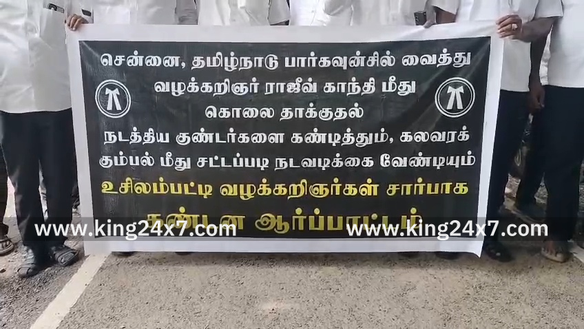 மதுரை மாவட்டம் உசிலம்பட்டி வழக்கறிஞர்கள் சங்கம் சார்பில் நேற்று (அக்.13)உசிலம்பட்டி நீதிமன்ற வளாகம் முன்பு வழக்கறிஞர்கள் கண்டன ஆர்ப்பாட்டத்தில் ஈடுபட்டனர். வழக்கறிஞர் ராஜிவ் காந்தியை தாக்கியவர்கள் மீது காவல்துறை உரிய நடவடிக்கை எடுக்க கோரியும், விசிக தலைவர் திருமாவளவனை கைது செய்ய கோரியும், வழக்கறிஞர்கள் பாதுகாப்பை உறுதி செய்யாத தமிழ்நாடு பாண்டிச்சேரி பார்கவுன்சில்-க்கு கண்டனத்தையும் பதிவு செய்து கோஷங்களை எழுப்பி ஆர்ப்பாட்டம் ஈடுபட்டனர்.
