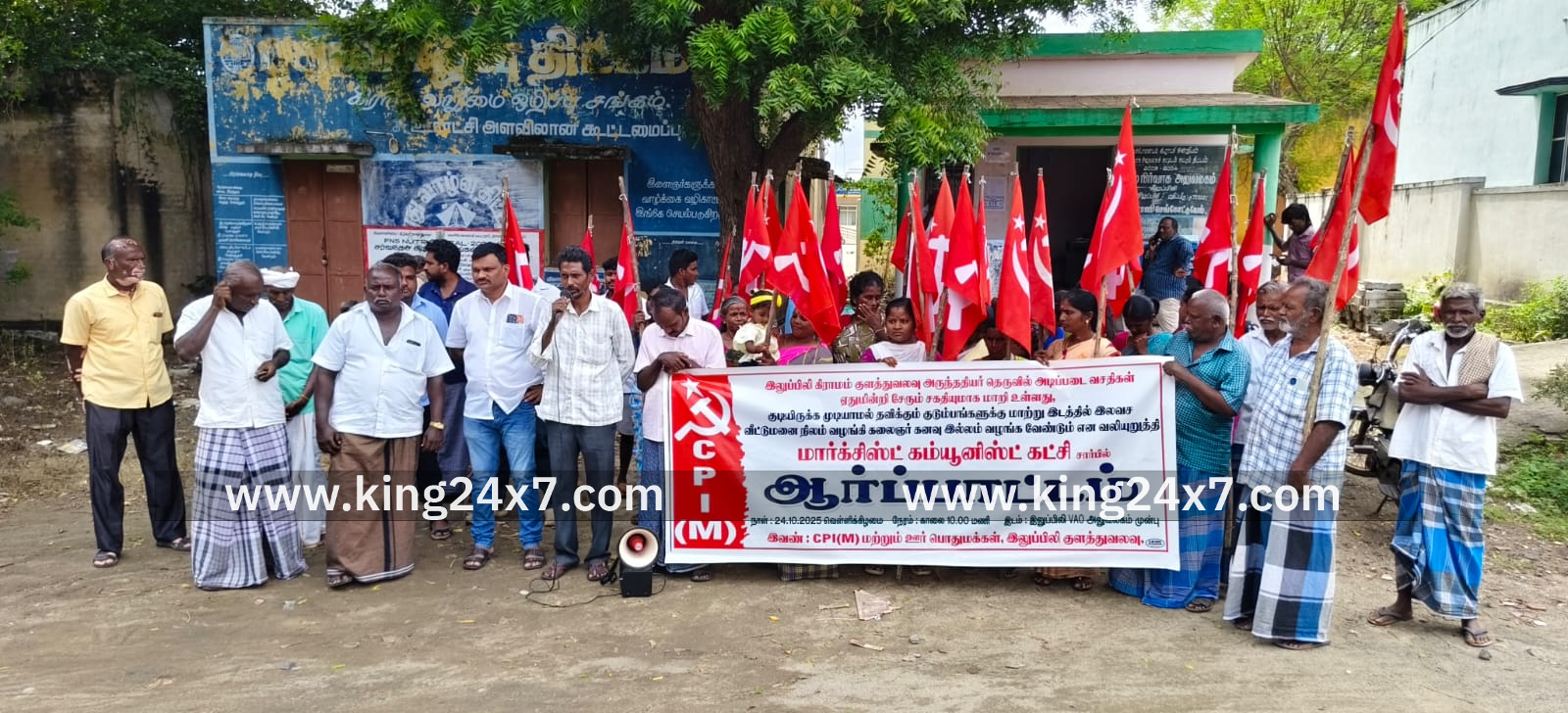 திருச்செங்கோடு அருகே எலச்சிபாளையம் ஒன்றியம் இலுப்புலி கிராமம் குளத்துவலவில் 20க்கும் மேற்பட்ட குடும்பங்கள்பல வருடங்களாக குடியிருந்து வருகின்றனர்.இவர்களுக்கு இலவச வீட்டு நிலம் மற்றும் கலைஞர் கனவு இல்லம் வழங்க வேண்டும் என வலியுறுத்தி இலுப்புலி கிராம நிர்வாக அலுவலகம் முன்பு. ஆர்ப்பாட்டம் நடைபெற்றது. இலுப்புலி கிராமம் குளத்துவலவு அருந்ததியர் தெருவில் 20க்கும் மேற்பட்ட குடும்பங்கள் 40 வருடங்களுக்கு மேலாக வசித்து வருகின்றனர் குடியிருப்பு அருகில் இலுப்புலி 150 ஏக்கர் ஏரி உள்ளது. இதனால் மழைக்காலங்களில் மழை நீர் வீடுகளுக்குள் புகுந்து மண் சுவர்கள் இடிந்து படிப்படியாக அரித்து கொண்டே உள்ளன சாலை வசதி. சாக்கடை வசதி இல்லாததால் மழை நீர் சூழ்ந்து சேரும் சகதியுமாக மழை காலங்களில் மாறியுள்ளன தொடர்ந்து குடியிருக்க முடியாத சூழ்நிலை ஏற்பட்ட வண்ணம் உள்ளன இதனை தொடர்ந்து மார்க்சிஸ்ட் கம்யூனிஸ்ட் கட்சியினர் குளத்து வலவுபொதுமக்களுக்கு இலவச வீட்டுமனை நிலம் வேறு இடத்தில் வழங்க வேண்டும். கலைஞர் கனவு இல்லம் மூலம் வீடுகள் கட்டி தர வேண்டும். இவ்வூரில் மருத்துவ முகாம் அமைத்து கை கால்கள் தொற்று நோய்கள் ஏற்பட்டு இருப்பதை கவனித்து மருத்துவம் பார்க்க வேண்டும் என கோரிக்கை வைத்துஆர்ப்பாட்டத்தில் ஈடுபட்டனர் ஆர்ப்பாட்டத்திற்கு கிளை செயலாளர் எம்.தங்கவேல் தலைமை வகித்தார். ஒன்றியக் குழு உறுப்பினர்கள் பி.கிட்டுசாமி . ஆர்.ஈஸ்வரன் முன்னிலை வகித்தனர். கட்சியின் மாவட்ட செயற்குழு உறுப்பினர் சு.சுரேஷ் கோரிக்கைகளை விளக்கி பேசினார்.மூத்த தோழர் பெரியசாமி.சிறுபான்மை நலக்குழு உறுப்பினர் பாபு. வாழ்த்தி பேசினார்கள் சத்யாநகர் கிளை செயலாளர் பி.கே . ரவி நன்றி உரையாற்றினார்.ஆர்ப்பாட்டத்தில் 15 பெண்கள் உட்பட 50க்கும் மேற்பட்டவர்கள் கலந்து கொண்டனர்