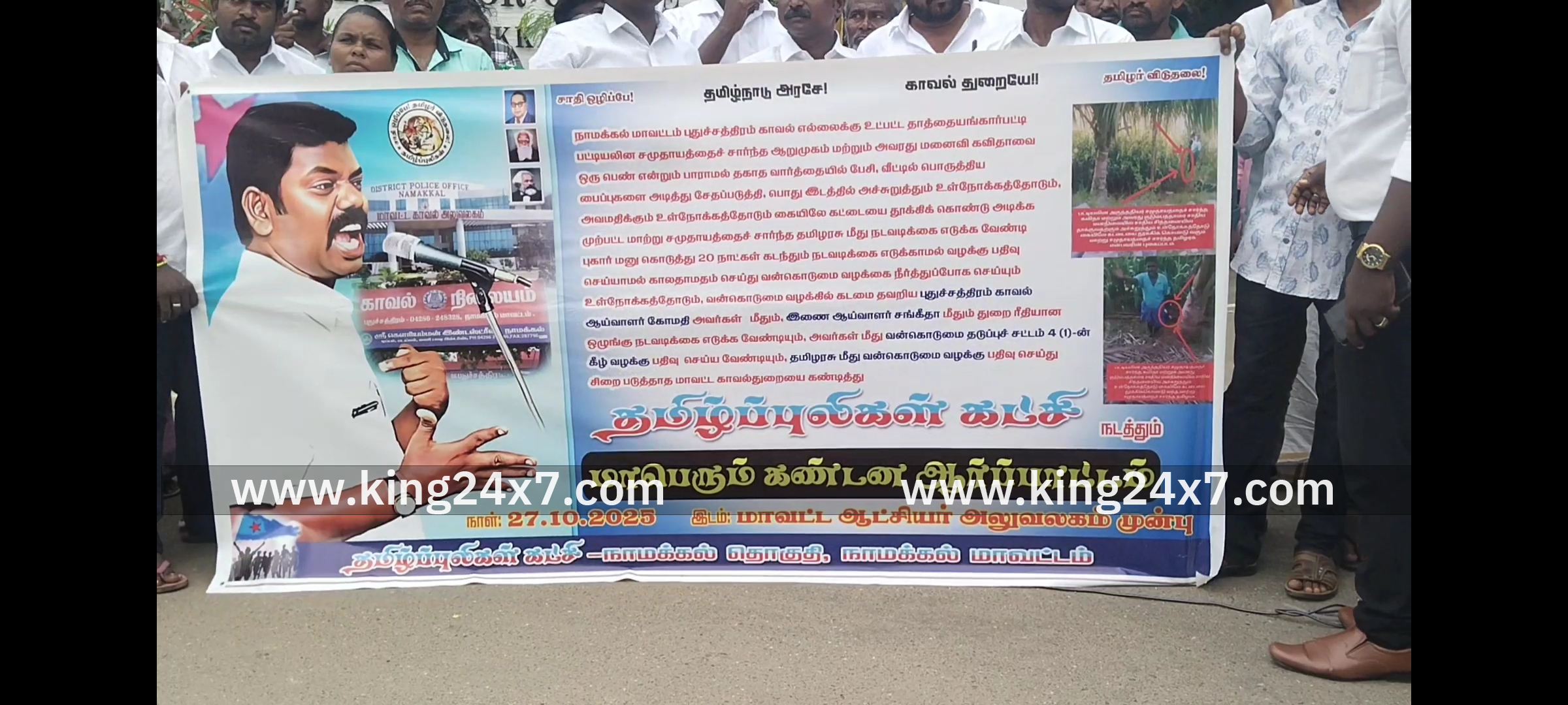 நாமக்கல் மாவட்டம் புதுச்சத்திரம் காவல் நிலையத்திற்குட்பட்ட பகுதியில் வன்கொடுமை, பாலியல் சம்பவங்களில் பாதிக்கப்படும் பட்டியலின மக்கள் அளிக்கும் புகார்கள் மீது நடவடிக்கை எடுக்காத புதுச்சத்திரம் காவல் ஆய்வாளர் கோமதி, உதவி ஆய்வாளர் சங்கீதா ஆகிய இருவரை கண்டித்து நாமக்கல் மாவட்ட ஆட்சியர் அலுவலகம் முன்பு தமிழ்ப்புலிகள் கட்சியின் மாவட்ட செயலாளர் குமரவேல் தலைமையில் அக்கட்சியினர் ஆர்ப்பாட்டத்தில் ஈடுபட்டனர்.அப்போது பட்டியலின மக்கள் கொடுக்கும் புகார்கள் மீது ஆய்வாளர் கோமதி, உதவி ஆய்வாளர் சங்கீதா ஆகியோர் நடவடிக்கை எடுக்காமல் புகார் அளிக்க வரும் நபர்களிடம் தகாத வார்த்தையில் பேசியும் வருகின்றனர் எனவே இருவர் மீதும் துறை ரீதியாக நடவடிக்கை எடுக்க வேண்டும் மேலும் வன்கொடுமை தடுப்பு சட்டத்தின் கீழ் அவர்கள் மீது வழக்கு பதிவு செய்ய வேண்டும் எனக்கூறி தமிழ் புலிகள் கட்சியினர் முழக்கங்களை எழுப்பி ஆர்ப்பாட்டத்தில் ஈடுபட்டனர்