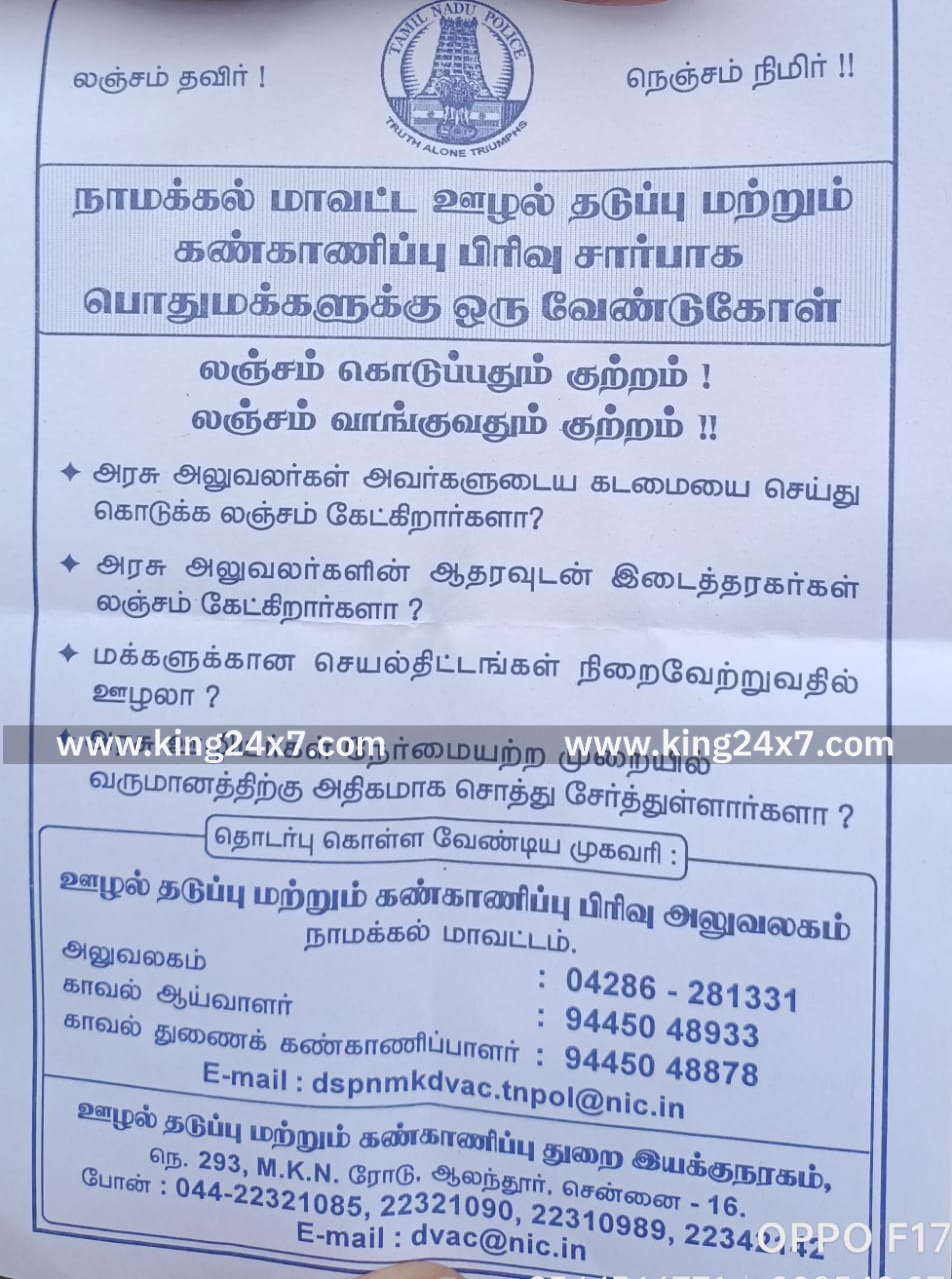 நாடு முழுவதும் ஊழல் தடுப்பு விழிப்புணர்வு வாரம் அக்டோபர் 27-ந்தேதி முதல் நவம்பர் 3-ந்தேதி வரை கடைபிடிக்கப்படுகிறது.இதையொட்டி நாமக்கல் மாவட்ட ஆட்சியர் அலுவலகத்தில் குறைத்தீர் முகாமில் கலந்து கொள்ள வருகை தந்த பொதுமக்களிடம் ஊழல் தடுப்பு மற்றும் கண்காணிப்பு பிரிவு போலீஸ் இன்ஸ்பெக்டர் பிரபு மற்றும் சப் இன்ஸ்பெக்டர் புருஷோத்தமன் லஞ்ச ஒழிப்பு குறித்து துண்டு பிரசுரங்களை வழங்கி விழிப்புணர்வு ஏற்படுத்தினர்.மேலும் லஞ்சம் கொடுப்பவர்கள் மற்றும் வாங்குபவர்கள் பற்றி புகார் தெரிவிக்க அறிவுறுத்தினார்.தொடர்ந்து ஒரு வாரத்திற்கு அனைத்து அரசு அலுவலகங்கள் பள்ளி, கல்லூரி மற்றும் பொதுமக்கள் அதிகம் கூடும் இடங்களில் விழிப்புணர்வு பிரச்சாரம் செய்ய இருக்கிறோம் என்று அதிகாரிகள் தெரிவித்தனர்.