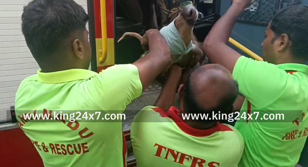 கரூரில் குடியிருப்புப் பகுதிக்கு தவறி வந்த புள்ளி மான் - விரைந்து வந்த தீயணைப்பு துறையினர்,மானை பிடித்து வனத்துறையிடம் ஒப்படைக்க எடுத்துச் சென்றனர்.