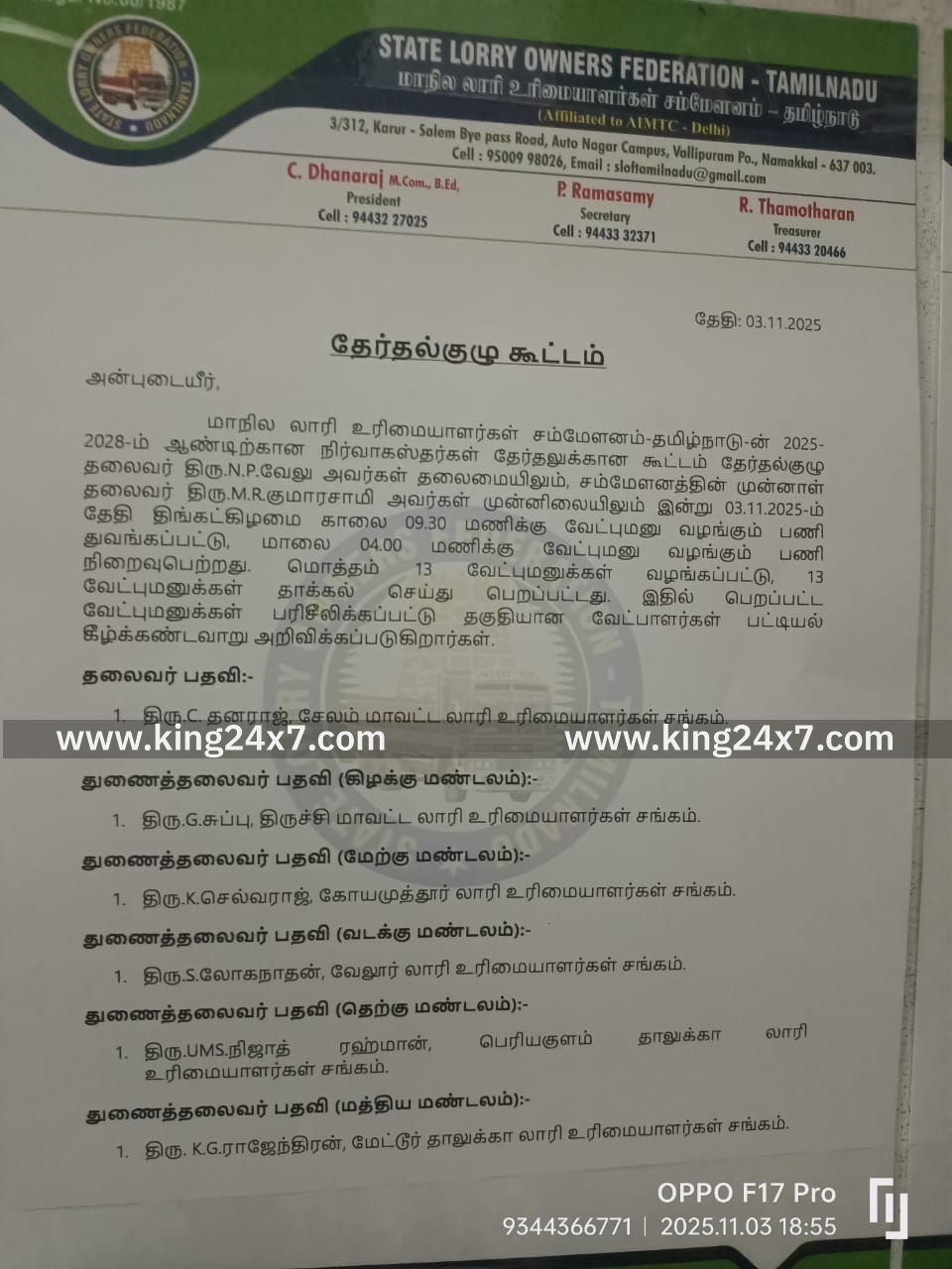 லாரி உரிமையாளர்கள் சம்மேளனத்தில் தலைவர் /செயலாளர் /பொருளாளர் /ஐந்து துணைத் தலைவர்கள்,ஐந்து இணை செயலாளர்கள் என மொத்தம் 13 பதவிக்கு தேர்தல் நடைபெறுகிறது.;