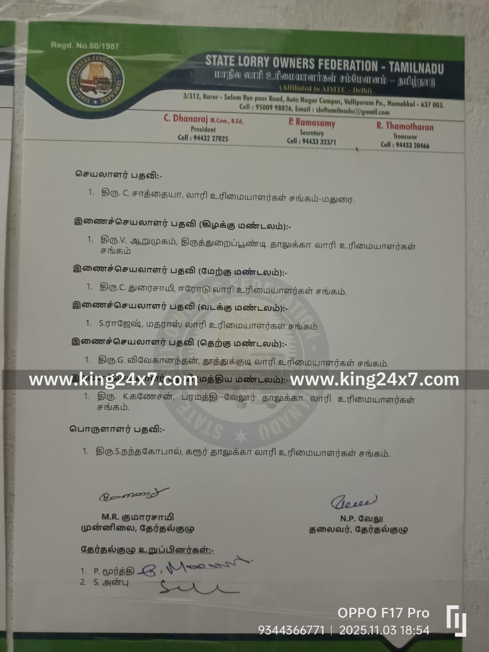 2025-28 மாநில லாரி உரிமையாளர்கள் சம்மேளனத்தின்- தமிழ்நாடு தோ்தலுக்கான வேட்பு மனு தாக்கல் திங்கள்கிழமை காலையில் தொடங்கி மாலை 4 மணிக்கு நிறைவடைந்தது.நாமக்கல்லை தலைமை இடமாகக் கொண்டு மாநில லாரி உரிமைகள் சம்மேளனம்- தமிழ்நாடு செயல்பட்டு வருகிறது. தமிழகத்தில் 38 மாவட்டங்களில் உள்ள 111லாரி உரிமையாளர் சங்கங்கள் சம்மேளனத்தில் இணைந்துள்ளது.2025-28 ஆம் ஆண்டிற்கான புதிய நிர்வாகிகள் தேர்தல் வருகின்ற நவம்பர் 19ஆம் தேதி நாமக்கல்- பரமத்தி சாலை வள்ளிபுரத்தில் உள்ள சம்மேளன தலைமை இடத்தில் நடைப்பெறும்.லாரி உரிமையாளர்கள் சம்மேளனத்தில் தலைவர் /செயலாளர் /பொருளாளர் /ஐந்து துணைத் தலைவர்கள்,ஐந்து இணை செயலாளர்கள் என மொத்தம் 13 பதவிக்கு தேர்தல் நடைபெறுகிறது.தேர்தல் குழு தலைவராக அனிதா வேலு தலைமையில் தேர்தல் குழு அமைக்கப்பட்டுள்ளது, இந்த குழுவில் குமாரசாமி, மூர்த்தி, அன்பு ஆகியோர் உள்ளனர்.தோ்தல் கமிட்டி வெளியிட்டுள்ள அட்டவணையின்படி, வேட்புமனு தாக்கல் திங்கள்கிழமை (நவம்பர் -3 ) காலை 9.30 மணிக்கு தொடங்கி மாலை 4 மணிக்கு முடிவடைந்தது. செல்லுபடியாகும் வேட்பு மனுக்களின் பட்டியல் அன்றே தினமே மாலை 6.30 மணிக்கு வெளியிடப்பட்டது. வேட்பு மனுக்கள் வாபஸ் பெறுவதற்கான காலம் வருகிற புதன்கிழமை (நவம்பர் -5) காலை 10 மணி முதல் மதியம் 2 மணி வரை என நிா்ணயிக்கப்பட்டுள்ளது. புதன்கிழமை மாலை 5 மணியளவில் இறுதி வேட்பாளர் பட்டியல் வெளியிடப்படும்.*மேற்கண்ட பதவிகளுக்கு வேறு யாரும் போட்டியிடவில்லை என்பதால் வேட்புமனு தாக்கல் செய்த அனைவரும் ஏகமனதாக தேர்வு செய்யப்படுவார்கள் என்பது குறிப்பிடத்தக்கது.