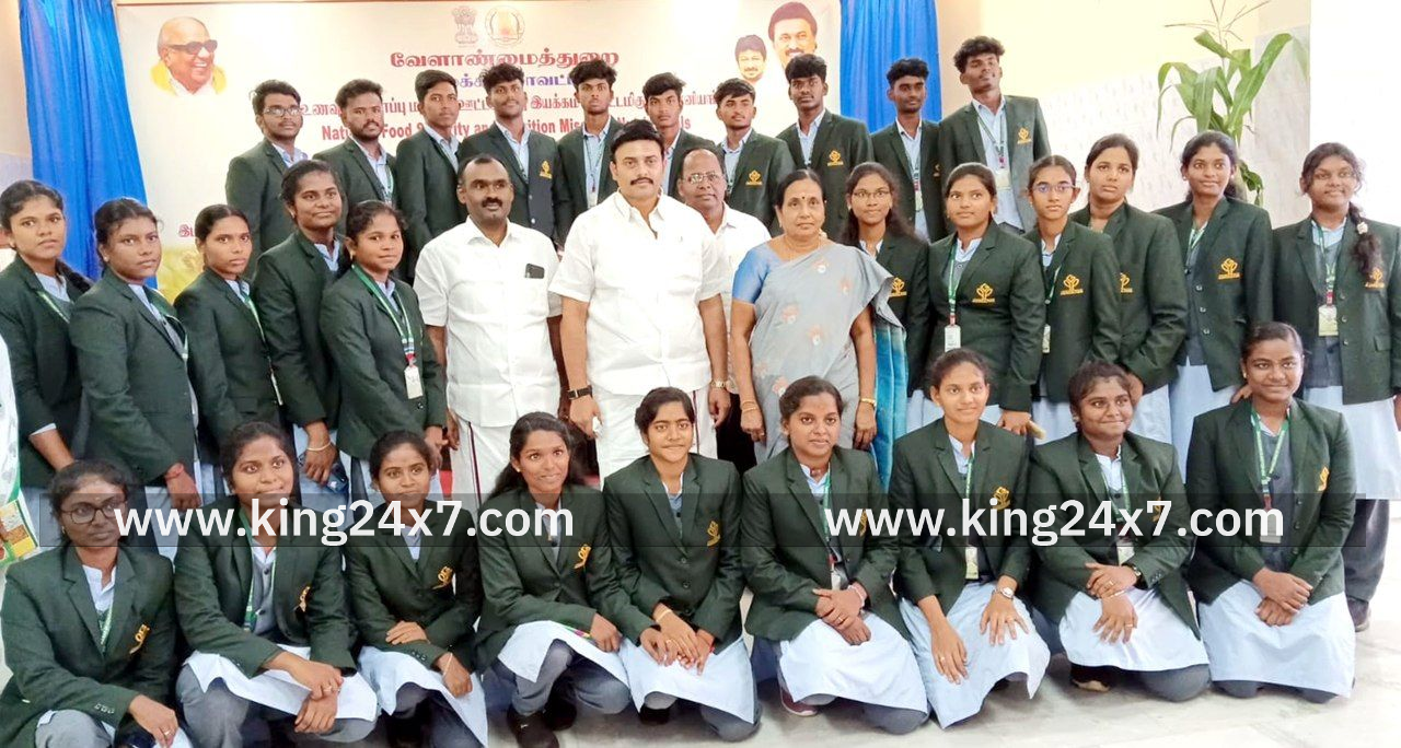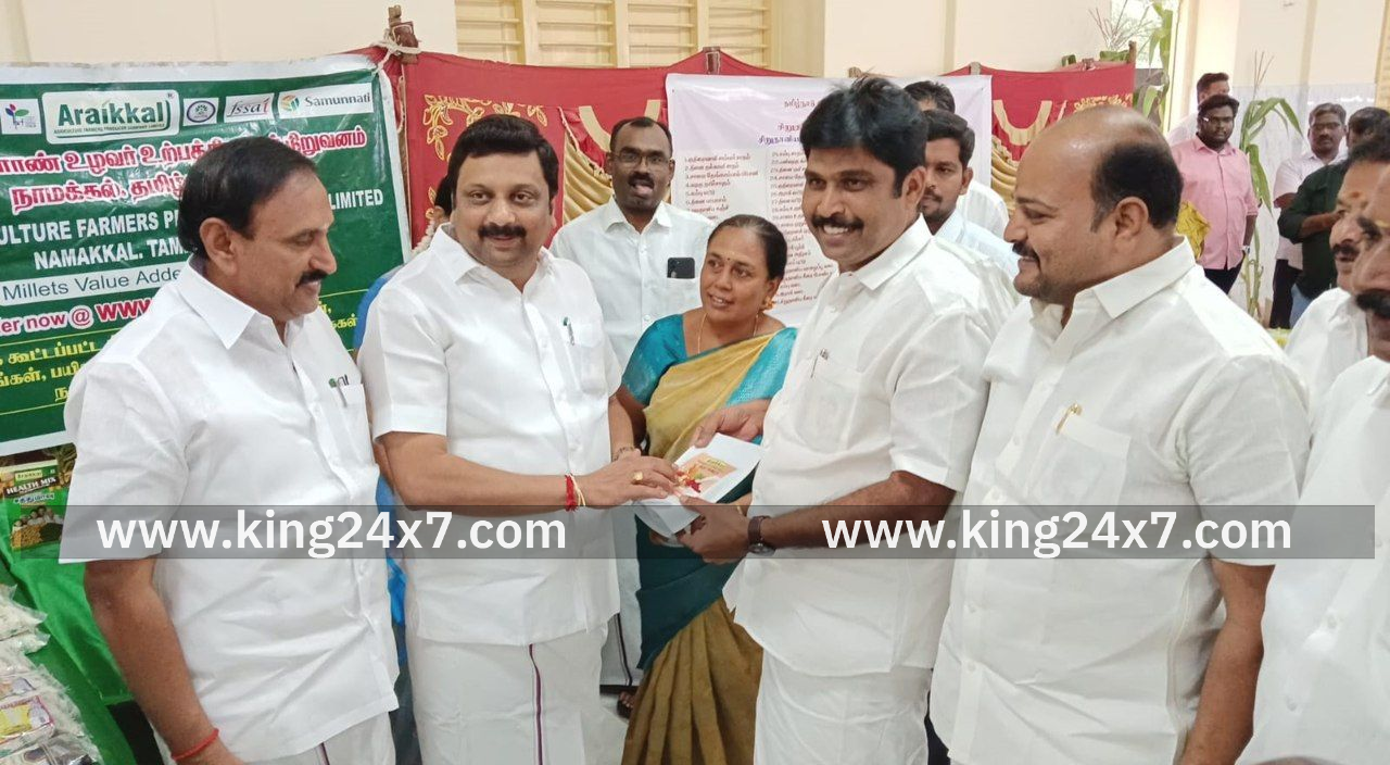 தேசிய உணவுப்பாதுகாப்பு மற்றும் ஊட்டச்சத்து இயக்கம் கீழ் சிறுதானிய உணவு திருவிழாவினை தொடங்கி வைத்த அமைச்சர் மா மதிவேந்தன் மற்றும் எம்.பி கே.ஆர்.அண்ட் ராஜேஷ்குமார்.