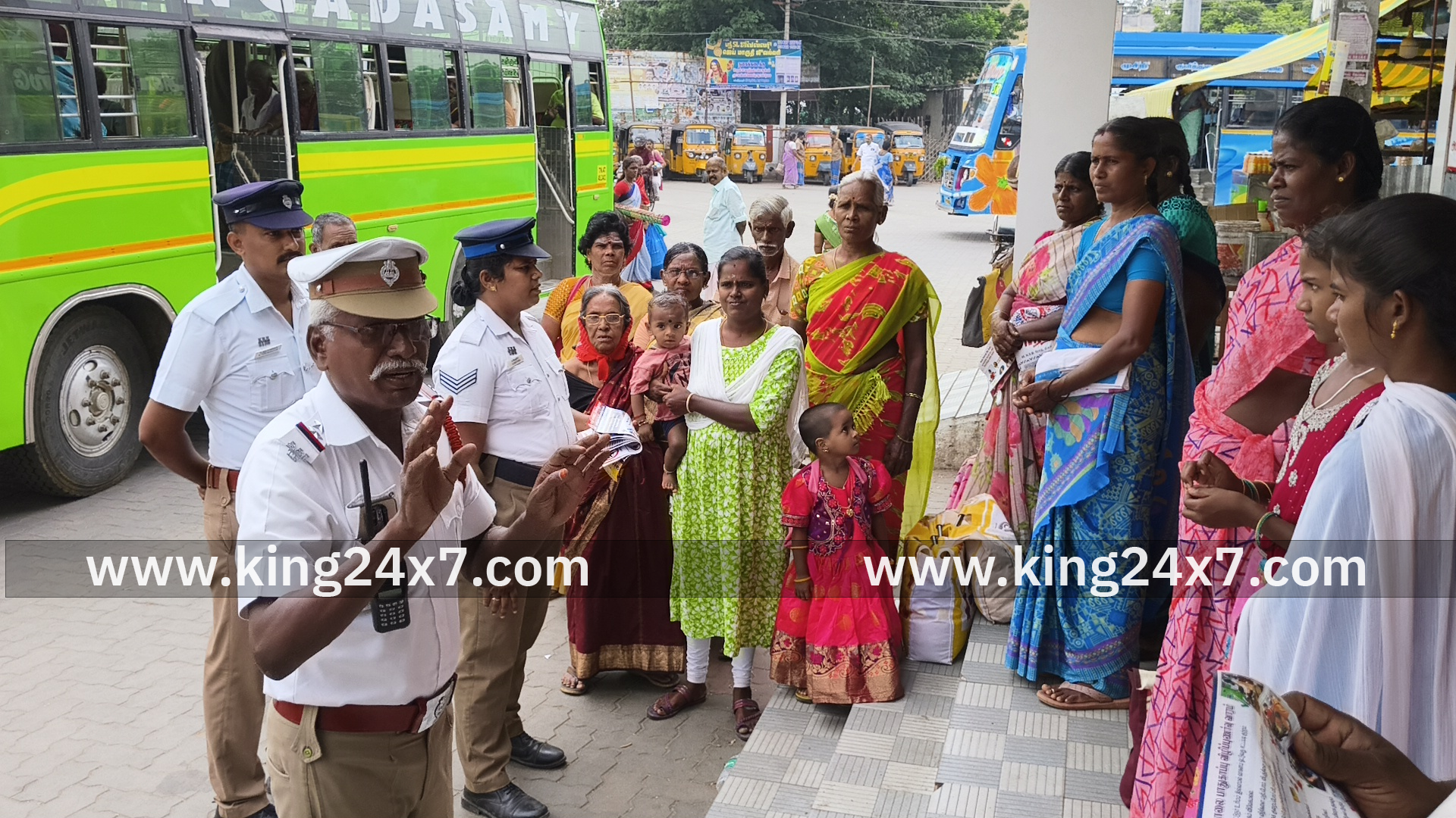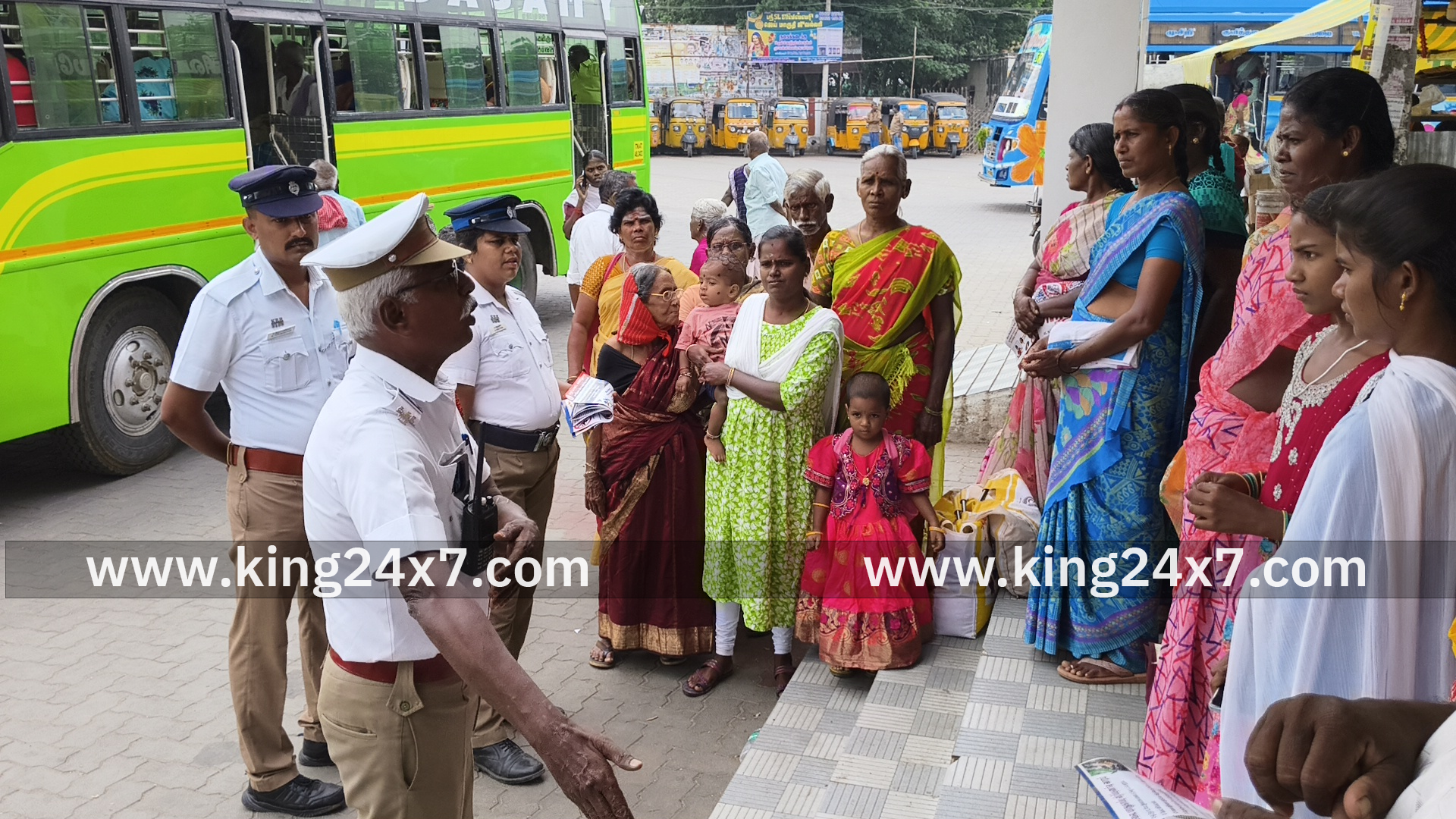 பேருந்து நிலையத்தில் ஆட்டோ ஓட்டுநர்கள் மற்றும் பொதுமக்களிடம் துண்டறிக்கை வழங்கி விழிப்புணர்வு;