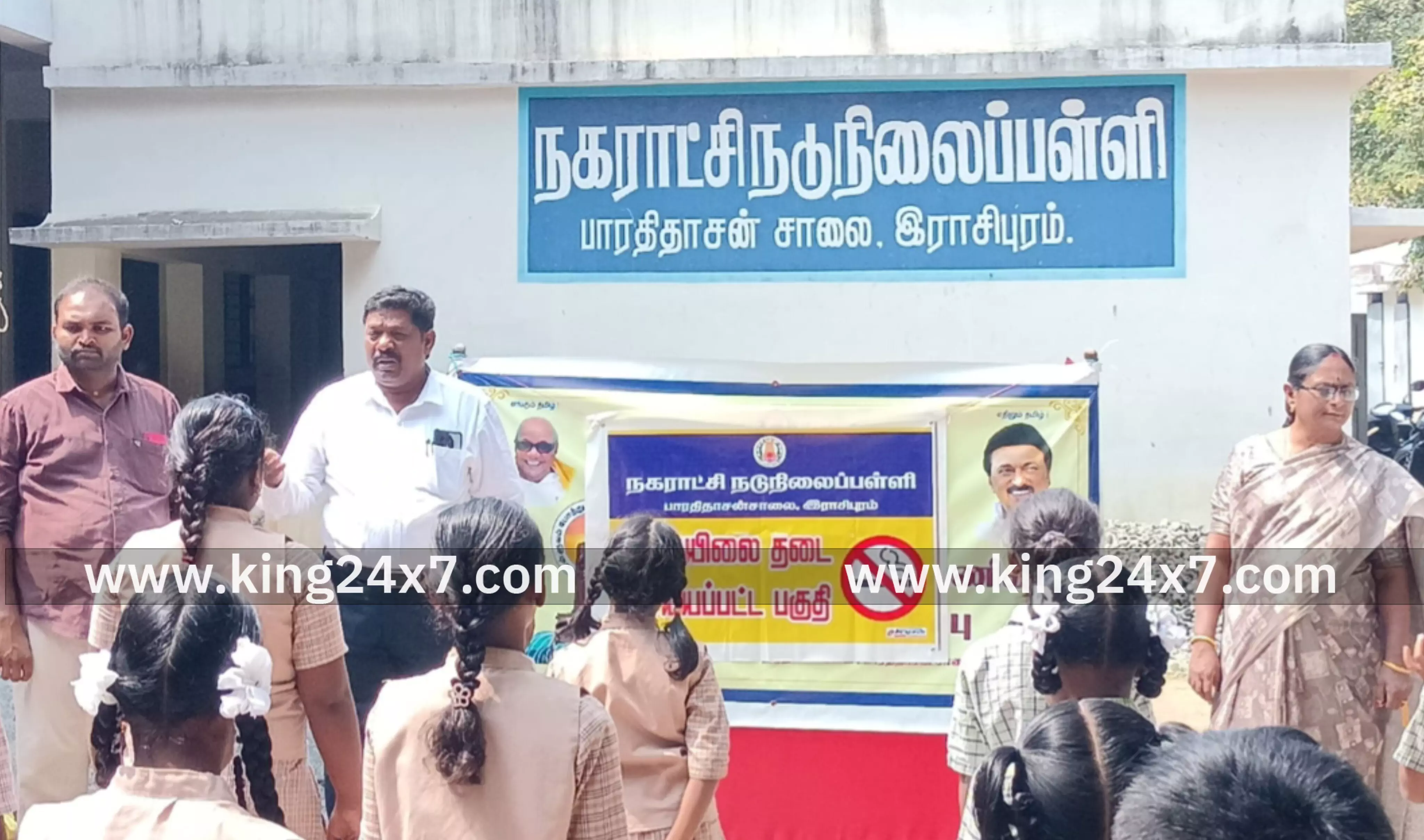 நாமக்கல் மாவட்ட ஆட்சித் தலைவர் திருமதி துர்கா மூர்த்தி ஐஏஎஸ் அவர்கள் ஆணையின்படி நாமக்கல் மாவட்டம் போதை பொருள் இல்லாத மாவட்டம் என்ற நிலையை உருவாக்க வேண்டும் என்ற உன்னத நோக்கத்தின்படி ஒவ்வொரு பள்ளியிலும் போதைப் பொருள் விழிப்புணர்வு குழு உருவாக்கப்பட்டு இருக்க வேண்டும். பள்ளி வளாகத்தைச் சுற்றிலும் எந்த ஒரு வகையிலும் எந்த வடிவிலும் போதைப் பொருள்கள் கிடைத்தல் தடை செய்யப்படுகிறது. அந்தப் பள்ளியில் பணியாற்றக்கூடிய ஆசிரியர்கள் Tamilnadu Drug Free APP செயலியை பதிவிறக்கம் செய்ய வேண்டும் இதன் வழியே தங்கள் பள்ளிகளில் போதைப்பொருள் சார்ந்த பதிவுகளை மேற்கொள்ள வேண்டும் பள்ளி வளாகத்திற்கு அருகிலோ அல்லது பள்ளி வளாகத்தை சுற்றிலும் எங்கேயும் போதை பொருள் எந்த வழியிலேயும் மாணவ மாணவியருக்கு கிடைத்ததை தடை செய்யும் நோக்கத்தில் இந்த செயலி ஒவ்வொரு ஆசிரியரும் பதிவிறக்கம் செய்து அதில் குறைகளை பதிவேற்றம் செய்ய வேண்டும். இது ரகசியம்காக்கப்படும் செயலிழியாகும். அதன் ஒரு பகுதியாக பள்ளிகளில் படிக்கும் குழந்தைகளுக்கு விழிப்புணர்வு ஏற்படுத்தப்பட்டது. அது சார்ந்து முன்னதாக உறுதிமொழி எடுக்கப்பட்டது. அதன் அடிப்படையில் இராசிபுரம், பாரதிதாசன் சாலையில் அமைந்துள்ள நகராட்சி நடுநிலைப் பள்ளியில் தலைமை ஆசிரியர் திருமதி கு. பாரதி அவர்கள் முன்னிலையில் நாமக்கல் மாவட்ட பள்ளித் துணை ஆய்வாளர் கை. பெரியசாமி அவர்களின் தலைமையில் ஆசிரியர் ஆசிரியைகள் மாணவ மாணவிகள் அனைவரும்போதைப் பொருள் ஒழிப்பு குறித்து உறுதிமொழி எடுத்துக் கொண்டனர்.
