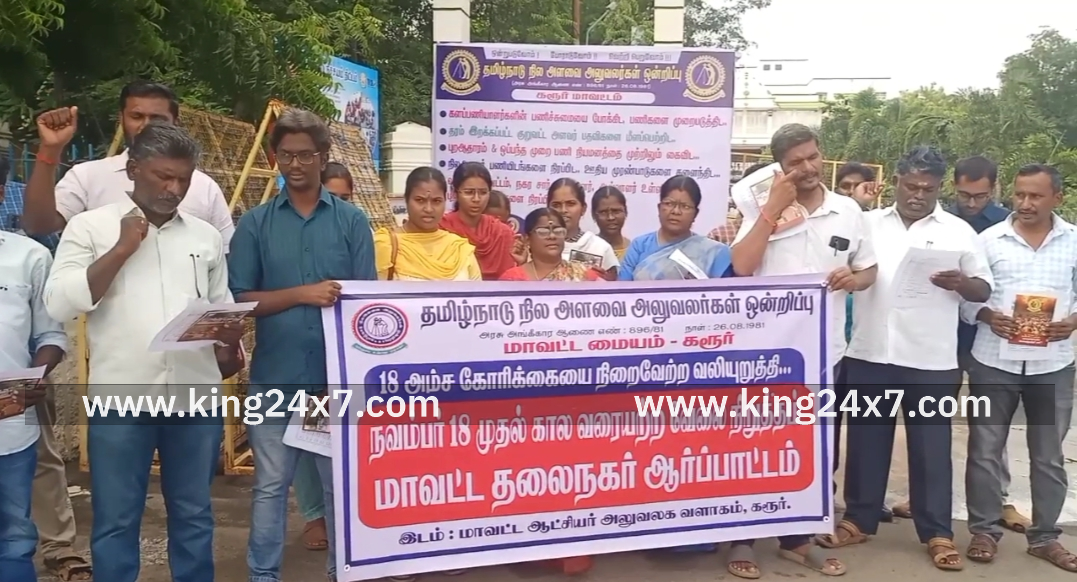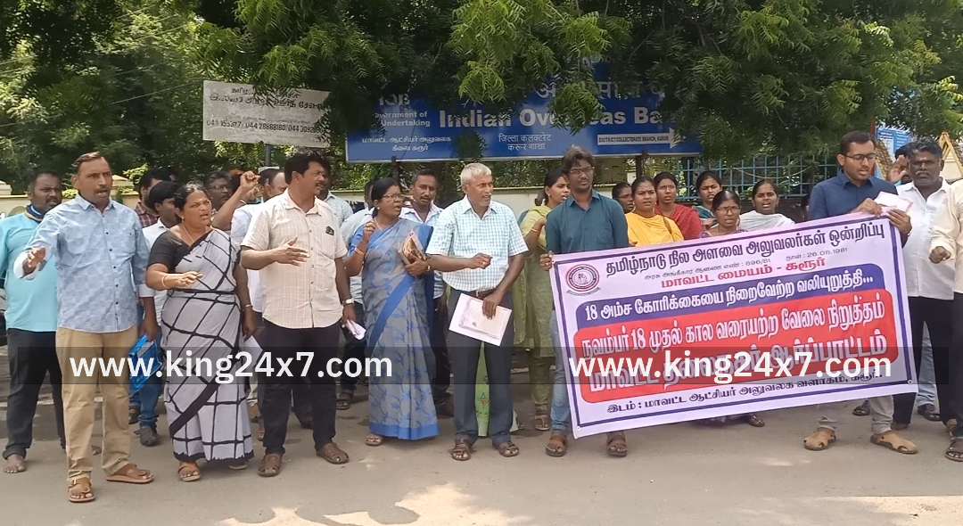 கரூரில் தமிழ்நாடு நில அளவை அலுவலர்கள் ஒன்றிப்பு சார்பில் நிலுவை கோரிக்கைகளை நிறைவேற்றிடக் கோரி காலவரையற்ற வேலை நிறுத்த போராட்டம்.