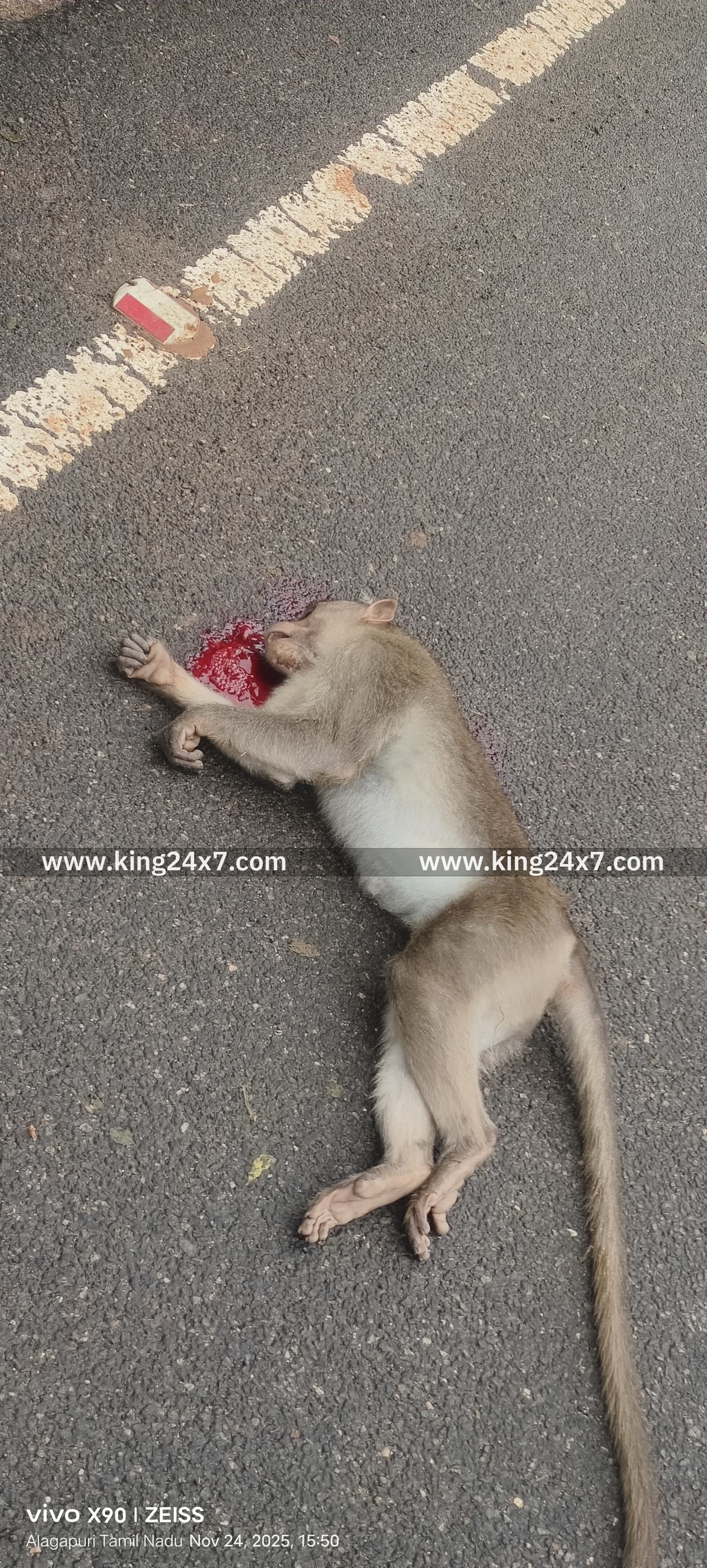 மணப்பாறை உணவுக்காக சாலையைக் கடக்க முயன்ற குரங்கு வாகனத்தில் அடிபட்டு உயிரிழப்பு;
