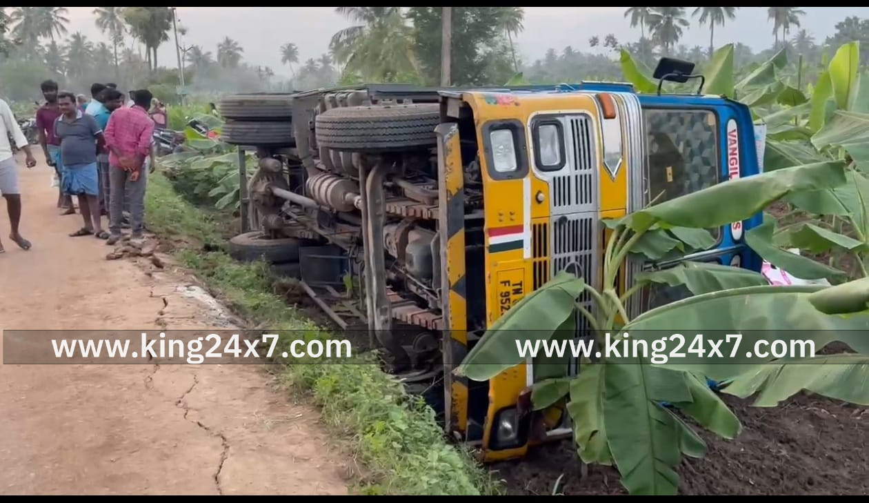 கண்ணமங்கலம் அருகே கோழித்தீவனம் ஏற்றிவந்த லாரி கவிழ்ந்து விபத்து.;