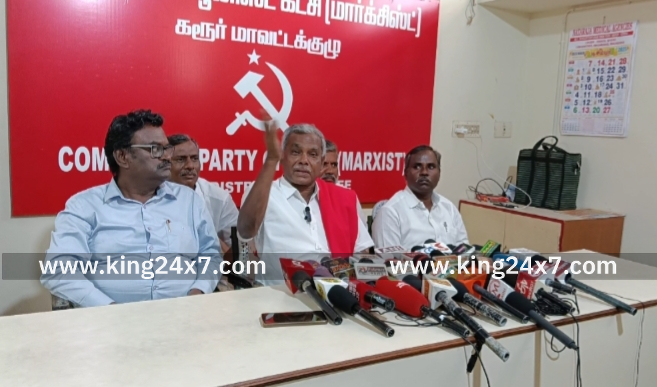 ஒரே ஒரு மாநகராட்சியை கைப்பற்றியதற்கு பிரதமர் மோடி ஏதோ இந்தியாவையே கைப்பற்றியது போல வாழ்த்து தெரிவித்துள்ளார். கரூரில் மார்க்சிஸ்ட் கம்யூனிஸ்ட் கட்சியின் மாநில செயலாளர் சண்முகம் பேட்டி. கரூர் மாவட்டத்திற்கு வருகை தந்த மார்க்சிஸ்ட் கம்யூனிஸ்ட் கட்சினுடைய மாநில செயலாளர் சண்முகம் இன்று கரூர் சுங்ககேட் பகுதியில் உள்ள கட்சி அலுவலகத்தில் செய்தியாளர்களை சந்தித்தார். அப்போது கரூரை அடுத்த வெண்ணைமலை பகுதியில் கோவில் இனாம் நிலங்களில் பல வருடங்களுக்கு முன்பு குடியிருந்து வரும் பொது மக்களின் வீடுகளை கோவில் நிலம் என்று கூறி சீல் வைப்பது, ஜப்தி செய்யும் நடவடிக்கையை அரசு கைவிட வேண்டும் எனவும், வாழ்வாதாரத்தையும் வாழ்வுரிமையையும் பாதுகாப்பதற்கு தான் நீதிமன்றமும் அரசும் உள்ளது. ஆனால் அந்த உரிமையை பறிப்பதற்கு அரசுக்கோ நீதிமன்றத்திற்கு இல்லை எனவும், வரும் 18ஆம் தேதி இந்து அறநிலை துறை சீல் வைக்கும் முடிவை கைவிட வேண்டும்.அல்லது அரசு தடுக்க வேண்டும் என்றும், இந்தப் பிரச்சனையை தமிழக அரசு உயர்நீதிமன்றத்திலோ உச்சநீதிமன்றத்திலோ மக்களின் சார்பாக முறையிட்டு சட்டப்படியான நடவடிக்கைகளை எடுக்க வேண்டும் என்றார். கேரளாவில் நேற்று உள்ளாட்சித் தேர்தல் முடிவுகளில் கம்யூனிஸ்ட் கட்சிகள் தோல்வியை தழுவி காங்கிரஸ் கட்சி அதிக இடத்தை வென்றுள்ளது குறித்தும். பிஜேபி மாநகராட்சி பிடித்துள்ளது குறித்தும் செய்தியாளர்களின் கேள்விக்கு, கேரளாவில் உள்ள திருவனந்தபுரம் மாநகராட்சி மட்டும்தான் பிஜேபி அணி கைப்பற்றியுள்ளது. இதற்கு பிரதமர் மோடி ஏதோ இந்தியாவையே பிடித்தது போல வாழ்த்து செய்தி அனுப்பி உள்ளார். உண்மை நிலவரத்தில் இரண்டு முதல் மூன்று சதவீத வாக்குகள் மட்டுமே வித்தியாசம் உள்ளது. இதற்கான காரணத்தை கண்டறிந்து வரும் சட்டமன்றத் தேர்தலில் மீண்டும் கம்யூனிஸ்ட் வெற்றி பெறும் என தெரிவித்தார். தொடர்ந்து பேசிய அவர் தமிழக வெற்றி கழகம் கரூர் சம்பவத்திற்கு முன்பு, கரூர் சம்பவத்திற்கு பிறகு என்ற நிலைப்பாட்டில் தற்போது உள்ளது என்றும், கரூர் சம்பவத்திற்கு பிறகு நடைபெற்ற அனைத்து கூட்டங்களிலும் கொள்கை எதிரியை பற்றி எங்கும் விமர்சிக்கவில்லை என்றும், தற்போது சிபிஐ விசாரணை கரூர் சம்பவம் தொடர்பாக நடைபெற்று வருவதால், மத்திய அரசை எதிர்க்க வேண்டாம் என முடிவு எடுத்து இதுபோன்ற ஒரு முடிவை அவர்கள் மேற்கொண்டு இருக்கலாம் எனவும், பிஜேபி அதிமுக கூட்டணியை எதிர்ப்பது எங்கள் கட்சியின் முடிவு எனவும், திமுக விற்காக நாங்கள் இந்த முடிவை மேற்கொள்ளவில்லை எனவும் தெரிவித்தார்.