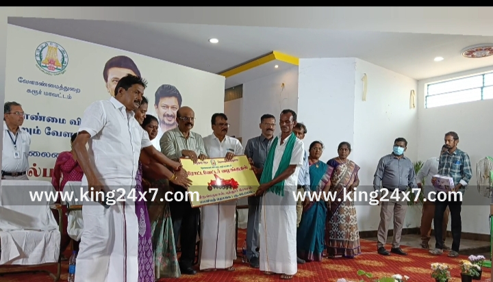 கரூரில் நடைபெற்ற உயிர்ம வேளாண்மை விழிப்புணர்வு கருத்தரங்கு மற்றும் வேளாண் கண்காட்சி யில் பயனாளிகளுக்கு நலத்திட்டங்களை வழங்கி வாழ்த்து தெரிவித்த ஆட்சியர் தங்கவேல்.;