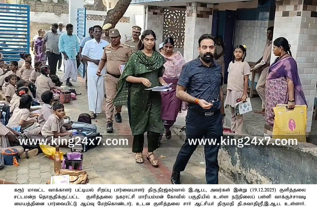 குளித்தலை நகராட்சி மாரியம்மன் கோவில் வாக்கு சாவடி மையத்தை பார்வையிட்டு ஆய்வு;