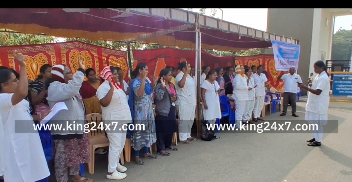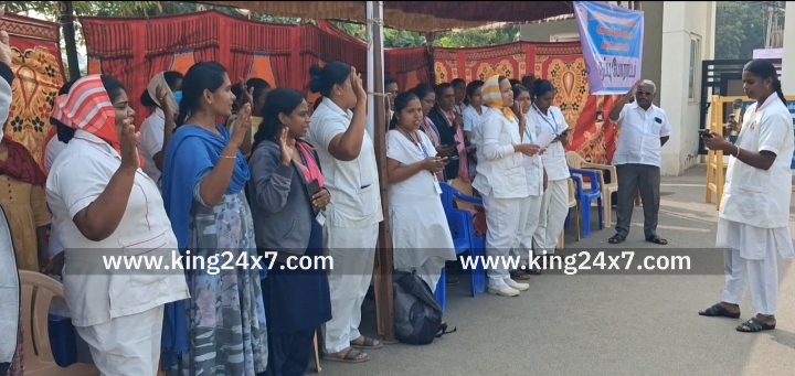 தமிழ்நாடு செவிலியர்கள் மேம்பாட்டு சங்கம் சார்பில் கரூரில் காத்திருப்பு போராட்டம். கரூர் அரசு மருத்துவக் கல்லூரி மருத்துவமனை வளாகத்திற்குள் 2-வது நாளாக தமிழ்நாடு செவிலியர்கள் மேம்பாட்டு சங்கம் சார்பில் 10 அம்ச கோரிக்கைகளை வலியுறுத்தி தமிழக அரசுக்கு எதிராக கண்டன கோஷங்கள் எழுப்பி காத்திருப்பு போராட்டத்தில் ஈடுபட்டு வருகின்றனர். தமிழ்நாடு செவிலியர்கள் மேம்பாட்டு சங்கம் மாவட்ட செயலாளர் தேவி தலைமையில் திமுக அரசு தேர்தல் வாக்குறுதியில் குறிப்பிட்டதை போல அனைத்து தொகுப்பூதிய செவிலியர்களையும் பணி நிரந்தரம் செய்ய வேண்டும், சென்னை உயர்நீதிமன்ற உத்தரவின் மீதான மேல்முறையீட்டை கைவிட்டு செவிலியர்களுக்கு சம வேலைக்கு சம ஊதியம் வழங்க வேண்டும், செவிலியர் கண்காணிப்பாளர் நிலை 3 பணியிடங்களை மீண்டும் உருவாக்கிட வேண்டும், கொரோனா காலகட்டத்தில் பணி செய்து பணி நீக்கம் செய்யப்பட்ட அனைத்து செவிலியர்களுக்கும் மீண்டும் பணி வழங்க வேண்டும், செவிலியர்களுக்கு 7, 14, 20 மற்றும் 25 ஆண்டுகளில் பதவி உயர்வுக்கான ஊதிய நிர்ணயம் செய்திட வேண்டும் உள்ளிட்ட 10 அம்ச கோரிக்கைகளை வலியுறுத்தி தமிழக அரசுக்கு எதிராக கண்டன கோஷங்கள் எழுப்பினர்.