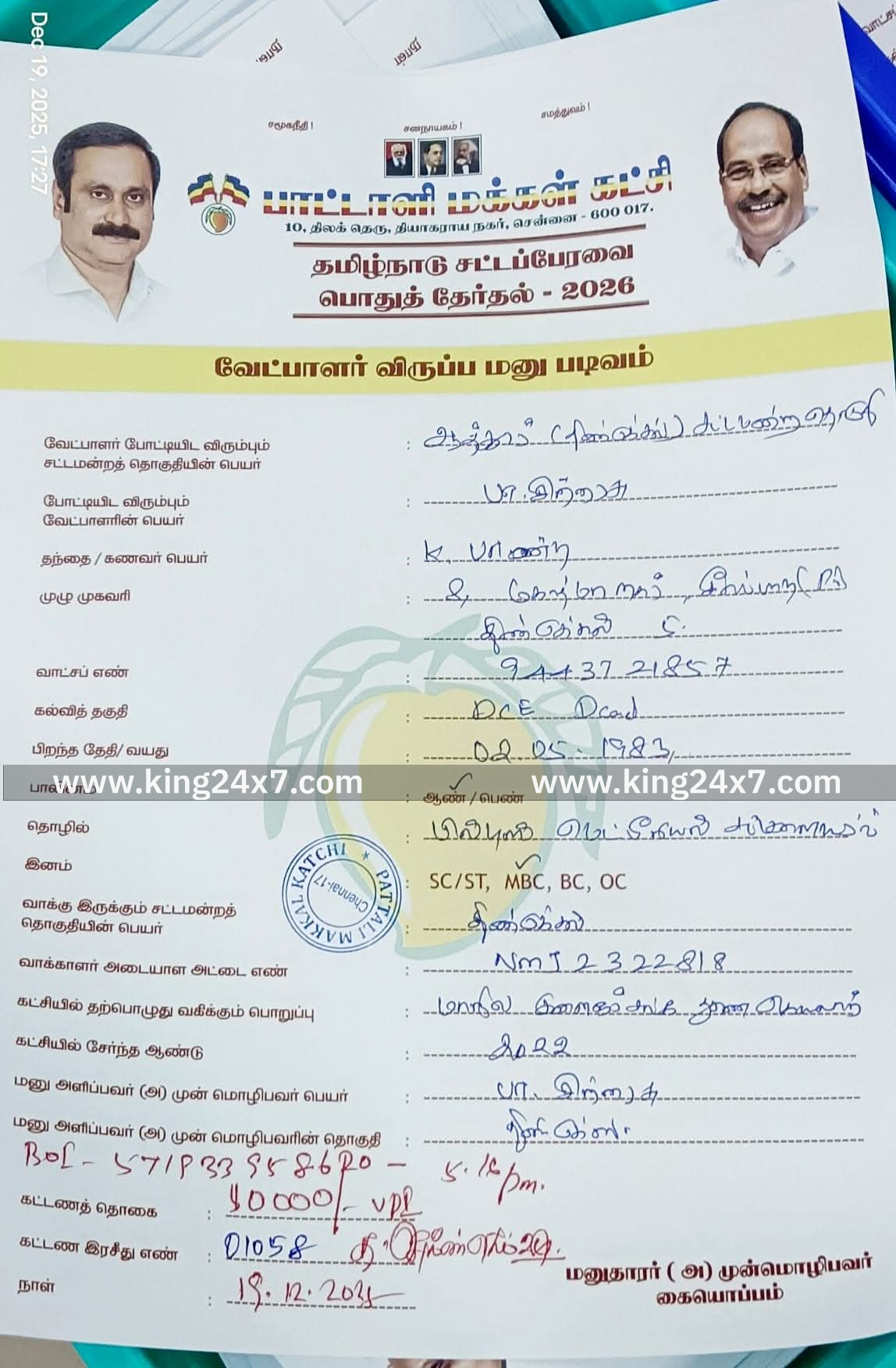 திண்டுக்கல் பாட்டாளி மக்கள் கட்சி சார்பில் திண்டுக்கல் சட்டமன்றத் தொகுதியில் மற்றும் ஆத்தூர் சட்டமன்ற தொகுதியில் போட்டியிடுவதற்காக மாநில இளைஞரணி துணைச் செயலாளர் திரு சிற்றரசு அவர்கள் விருப்பம் மனு தாக்கல் செய்தார்