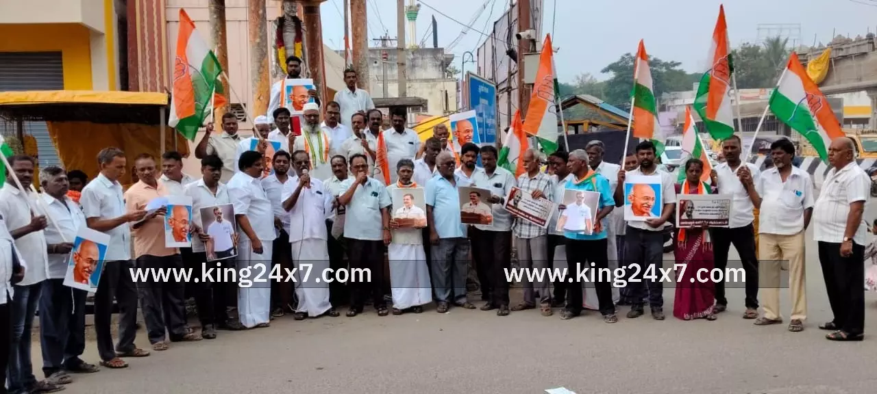 ராணிப்பேட்டை மாவட்டம் ஆற்காடு பேருந்து நிலையம் காந்தி சிலை அருகில் மக்களவை கூட்டத் தொடரில் 100 நாள் வேலை திட்டத்தில் மகாத்மா காந்தி பெயரை நீக்குகின்ற சட்ட மசோதாவை கொண்டு வந்துள்ள மத்திய அரசை கண்டித்து காங்கிரஸ் கட்சியினர் ஆர்ப்பாட்டம் நடத்தினர்.;