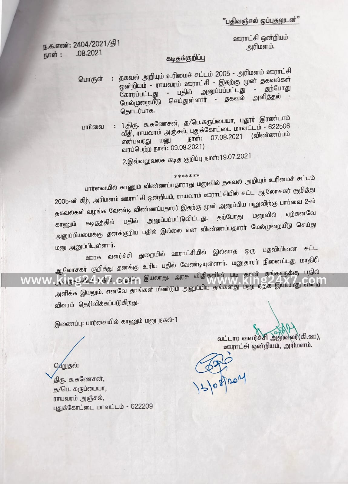 புதுக்கோட்டை மாவட்ட ஆட்சியரின் குறை தீர் மனு நீதி நாளில் இன்று 22.12.2025 உயர்நீதிமன்ற மதுரை கிளையில் உத்தரவின் பேரில் உதவி இயக்குனர் (தணிக்கை) இராயவரம்ஊராட்சியில் தணிக்கை செய்து நிதி இழப்பை கண்டறிந்து தண்டத்தீர்வையாக ரூ 466422 விதித்ததை ரத்து செய்ய முன்னால் தலைவி கலைச்செல்வி (எ)மீனா மேல்முறையீடு செய்துள்ளதில் தன்னுடைய கணவர் நாராயணனை சட்ட ஆலோசகராக (இல்லாத பதவியை)இவரே உருவாக்கி தனக்கு நிர்வாகம் தெரியாது என்று கூறி உள்ளதாகவும் இது நிதி முறைகேட்டை உறுதிப்படுத்துவதாகும் என்றும் எனவே உதவி இயக்குனர் தணிக்கை விதித்துள்ள தண்டத்தீர்வையை உறுதி செய்து முன்னாள் தலைவியின் மேல்முறையீட்டை ரத்து செய்ய வேண்டும் என இராயவரத்தை சேர்ந்த கருப்பையா மகன் கணேசன் என்பவர் மனு அளித்தார் இது மிகவும் பரபரப்பை ஏற்படுத்தியுள்ளது
