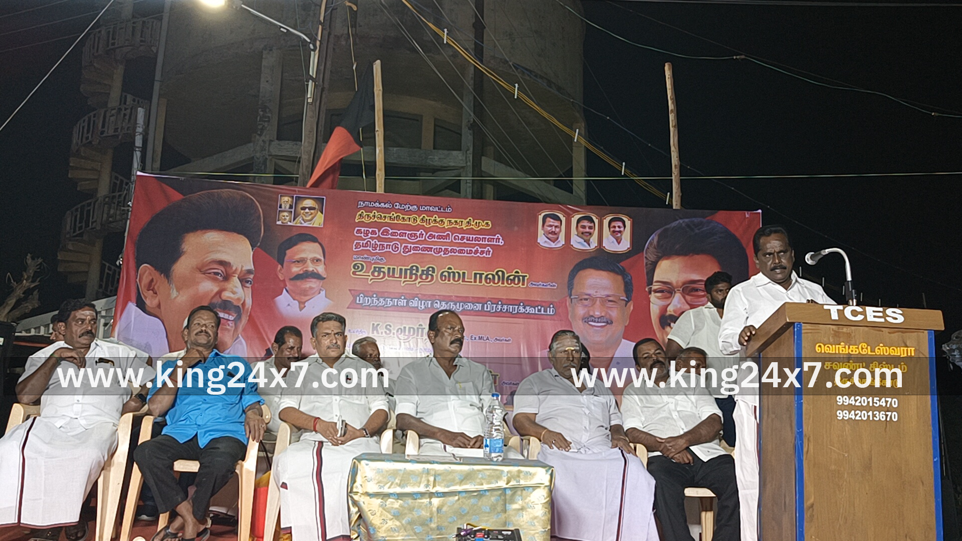 திருச்செங்கோடு கிழக்கு நகர திமுக சார்பில் தமிழ்நாடு துணை முதல்வர் திமுக இளைஞர் அணி செயலாளர் உதயநிதி பிறந்த நாள் விழாவை ஒட்டி தெருமுனை பிரச்சார பொதுக்கூட்டம் சிறப்பு பேச்சாளராக திமுக தலைமைக் கழக பேச்சாளர் பவானி கண்ணன், மற்றும் பேச்சாளர் குருசாமிபாளையம் ரவி ஆகியோர் கலந்து கொண்டு பேசினார்கள்;