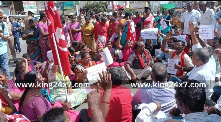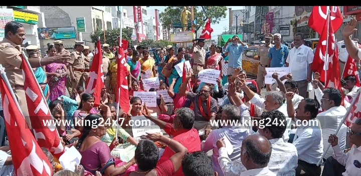 கரூரில் தொழிலாளர் விரோத நான்கு சட்ட தொகுப்புகளை திரும்பப் பெற வலியுறுத்தி சிஐடியு சார்பில் மறியல் போராட்டம்.