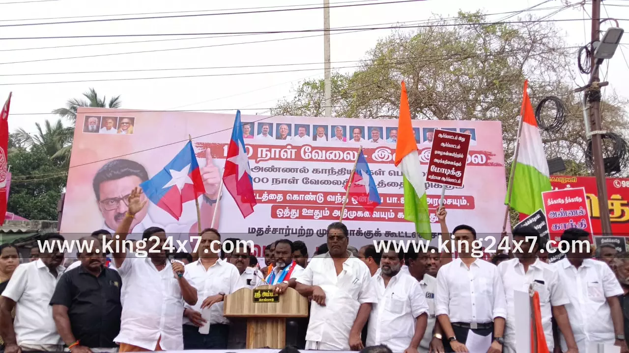 வாலாஜாபேட்டை ஊராட்சி ஒன்றிய அலுவலகம் முன்பாக திமுக கூட்டணி கட்சிகள் சார்பில் மகாத்மா காந்தி ஊரக வேலை வாய்ப்பு திட்டத்தை மாற்றியமைத்த மத்திய அரசு மற்றும் மத்திய அரசு திட்டத்திற்கு ஆதரவளித்து வரும் அதிமுகவையும் கண்டித்து திமுக கூட்டணி கட்சிகள் சார்பில் மாபெரும் கண்டன ஆர்ப்பாட்டம் நேற்று நடைபெற்றது. இந;