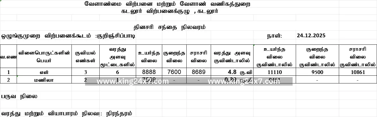 குறிஞ்சிப்பாடி ஒழுங்குமுறை விற்பனைக் கூடத்தில் தினந்தோறும் மார்க்கேட் நிலவரம் அறிவிப்பு மாறுபட்டு வருகிறது. இந்நிலையில், இன்று (டிச.24) எள் வரத்து 6 மூட்டை, மணிலா வரத்து 1 மூட்டை என மொத்தம் 7 மூட்டை வந்துள்ளது. இது மட்டும் இல்லாமல் வேறு எந்த இடு பொருட்களும் ஒழுங்குமுறை விற்பனைக் கூடத்தில் வரத்து வரவில்லை.