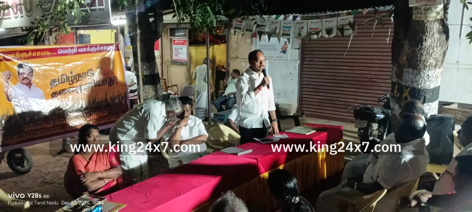 , புதுக்கோட்டை சட்டமன்ற தொகுதி, புதுக்கோட்டை வடக்கு மாநகரம்,என்_வாக்குச்சாவடி வெற்றி_வாக்குச்சாவடி மேனாள் சட்டமன்ற உறுப்பினர் உயர்திரு.கவிச்சுடர் கவிதைப் பித்தன் மற்றும் புதுக்கோட்டை வடக்கு மாவட்ட அவைத்தலைவர் .அரு.வீரமணி அவர்கள் முன்னிலையில் நிகழ்வில் புதுக்கோட்டை சட்டமன்ற உறுப்பினர் உயர்திரு.மரு.வை.முத்துராஜா , சிறப்புரையாற்றினார் புதுக்கோட்டை மாநகராட்சி மேயர் திருமதி திலகவதி செந்தில் புதுக்கோட்டை மாநகராட்சி துணை மேயர் புதுக்கோட்டை வடக்கு மாநகர பொறுப்பாளர் எம்.லியாகத் அலி 11வது வட்ட கழக செயலாளர் ரவீஸ் ரவி வட்ட செயலாளர்கள் செல்வராஜ் .அறிவழகன் புதுக்கோட்டை வடக்கு மாவட்ட துணை செயலாளர் மதியழகன் புதுக்கோட்டை வடக்கு மாநகர அவைத்தலைவர் .ரத்தினம் துணை செயலாளர் மணிவேலன் மற்றும் நிர்வாகிகள் அணிகளின் அமைப்பாளர்கள் துணை அமைப்பாளர்கள் கலந்துகொண்டு சிறப்பித்தார்கள் கூட்டத்தின் முடிவில்,கழக அரசின் சாதனைகள் அடங்கிய துண்டு, பிரசுரங்களை,நிர்வாகிகள் கடைகள் தோறும்,வீடு வீடாகவும் வழங்கினார்கள்