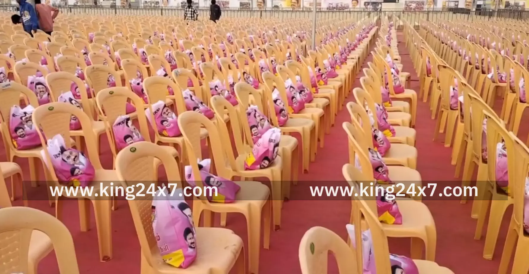 பல்லடம் அருகே வெல்லும் தமிழ் பெண்கள் மாநாடு!மாநாட்டிற்கு வருகை தரும் தொண்டர்களுக்கு இருக்கையில் வைக்கப்பட்டுள்ள உணவு பொருட்கள்;