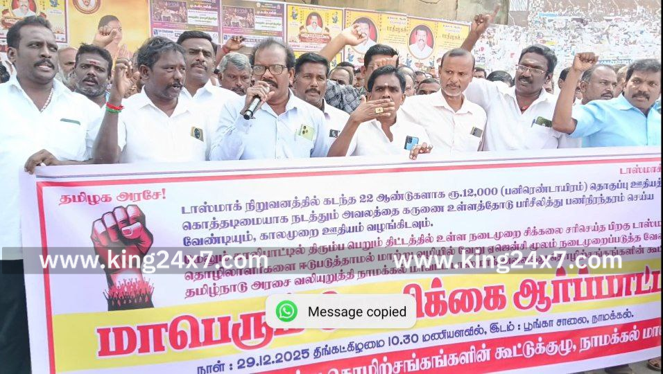 டாஸ்மாக் கடை ஊழியர்கள் சங்கத்தின் சார்பில் ஆர்ப்பாட்டம் மாவட்ட செயலாளர் சரவணன் தலைமையில் நடைபெற்றது இதில் தமிழக அரசு டாஸ்மாக் கடை விற்பனை செய்த காலி பாட்டில்களை திரும்ப பெறும் திட்டத்தை கைவிட வேண்டும் என கோரிக்கை கோஷங்களை முழங்கினர் இதில் நாமக்கல் மாவட்டத்தில் உள்ள சுமார் 200க்கும் மேற்பட்ட டாஸ்மாக் கடை விற்பனை ஊழியர்கள் பலர் பங்கேற்றனர்