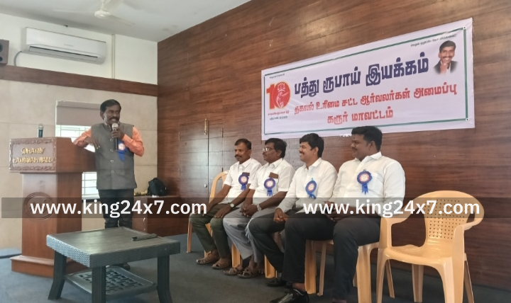 கரூரில் பத்து ரூபாய் இயக்கத்தின் சார்பில் சட்ட விழிப்புணர்வு பயிற்சி முகாம் நடைபெற்றது. கரூர் ஜவஹர் பஜார் பகுதியில் உள்ள தனியார் கூட்ட அரங்கில் பத்து ரூபாய் இயக்கத்தின் சட்ட விழிப்புணர்வு பயிற்சி முகாம் பத்து ரூபாய் இயக்கத்தின் மாநில பொதுச் செயலாளர் வழக்கறிஞர் நல்வினை விசுவராஜ் தலைமையில் நடைபெற்றது. இந்த கூட்டத்தில் துணை பொது செயலாளர்கள் வழக்கறிஞர் சதீஷ்குமார், பாஸ்கரன், மாநில பொதுச் செயலாளர் சீனிவாசன்,கரூர் மாவட்ட செயலாளர் பிரபாகரன், மாவட்ட ஆலோசகர் சரவணன் உள்ளிட்டோர் பங்கேற்ற இந்த கூட்டத்தில் பல்வேறு மாவட்டங்களைச் சேர்ந்த பொதுமக்கள் சட்ட விழிப்புணர்வு பெறுவதற்கான பயிற்சியில் பங்கேற்க வந்தனர். ஒவ்வொரு தனி மனிதனும் சட்டத்தைப் பற்றிய குறைந்த அளவாவது தெரிந்து கொண்டு இருக்க வேண்டும். அப்போதுதான் சட்டத்தின் வழியில் நடக்கும் ஆட்சியில் பாதிப்புகளை சந்திக்க நேர்ந்தால் அதனை எதிர்கொள்வதற்கு இந்த பயிற்சி உதவும் என்ற நோக்கில் பயிற்சி நடைபெற்றது.