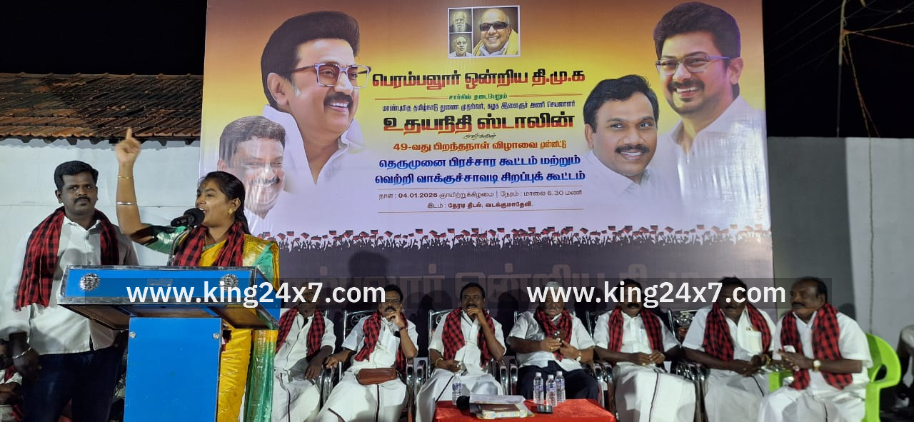 பெரம்பலூர் ஒன்றிய தி.மு.க.சார்பில், வடக்கு மாதவி கிராமத்தில், துணை முதலமைச்சர் உதயநிதி ஸ்டாலின் அவர்களின் பிறந்தநாள் விழா! தெருமுனைப் பிரச்சார கூட்டம் மற்றும் வெற்றி வாக்குச்சாவடி சிறப்புக்கூட்டம் நடைபெற்றது! கழக செய்தி தொடர்பாளர் க.நாகநந்தினி யுவராஜ், மாவட்ட கழக பொறுப்பாளர் வீ.ஜெகதீசன் கலந்து கொண்டு சிறப்புரையாற்றினார்கள். பெரம்பலூர் ஒன்றிய தி.மு.க.சார்பில், தமிழ்நாடு துணை முதலமைச்சர் உதயநிதி ஸ்டாலின் அவர்களின் 49- ஆவது பிறந்தநாள் விழாவை முன்னிட்டு, பெரம்பலூர் ஒன்றிய கழக செயலாளரும் - முன்னாள் சட்டமன்ற உறுப்பினருமான எம்.இராஜ்குமார் தலைமையில், பொதுக்குழு உறுப்பினர் செ.அண்ணாதுரை வரவேற்புரயில், ஒன்றிய துணைச் செயலாளர் தேவகிநடராஜன், நா.ஆதித்யன், முன்னாள் ஒன்றிய பெருந்தலைவர் மீனா அண்ணாதுரை, ஒன்றிய பொருளாளர் இரா.கலையரசன், ஒன்றிய அவைத்தலைவர் மு.இராமச்சந்திரன், கிளைச் செயலாளர்கள் பி.ஜெயராமன், சி.கலையரசன், மா.கார்த்திகேயன், ரா.சஞ்சீவ்குமார், பெ.திலகேஷ்வரன், மாவட்ட பிரதிநிதிகள் வா.இராஜ்குமார்,சி.இரமேஷ், சு.பிரபு ஆகியோர் முன்னிலையில் தெருமுனைப் பிரச்சார கூட்டம் மற்றும் வெற்றி வாக்குச்சாவடி சிறப்புக்கூட்டம் வடக்கு மாதவி கிராமத்தில் நடைபெற்றது. இந்த தெருமுனைப் பிரச்சார கூட்டத்தில் கழக செய்தி தொடர்பாளர் க.நாகநந்தினி யுவராஜ், மாவட்ட கழக பொறுப்பாளர் வீ.ஜெகதீசன் ஆகியோர் கலந்து கொண்டு சிறப்புரையாற்றினார்கள். இதில் தி.மு.க. அரசின் சாதனைகளையும், செயல்படுத்தப்பட்ட திட்டங்களையும் விரிவாக எடுத்து கூறினார்கள். தலைமை கழக பேச்சாளர்கள் எசனைஆறுமுகம், மு.விஜயரத்தினம், SRT.ராமலிங்கம், மாவட்ட ஆதிதிராவிடர் நலக்குழு அமைப்பாளர் ஆர்.குமார், லெட்சுமணன் உள்ளிட்டோர் கலந்து கொண்டனர். வடக்கு மாதவி கிளைச் செயலாளர் ரா.சதீஷ்குமார் நன்றியுரையாற்றினார்.