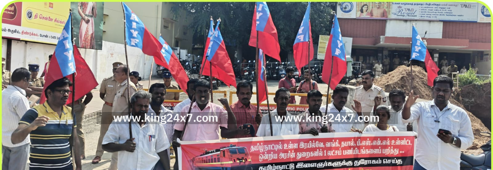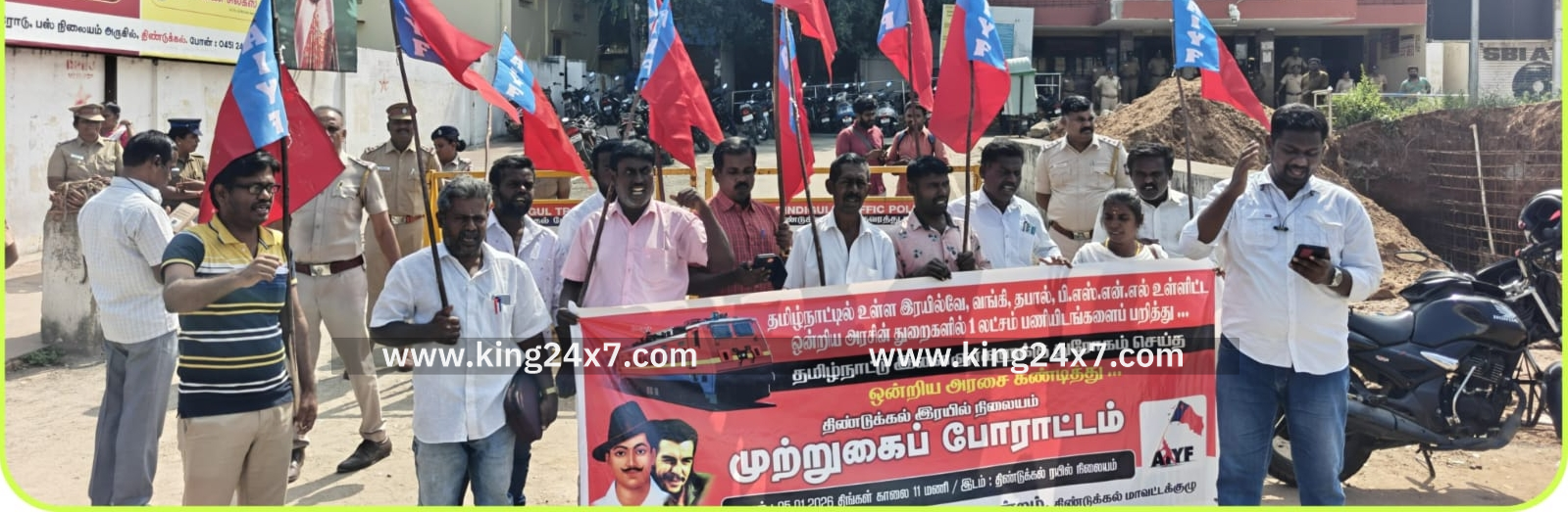 திண்டுக்கல் ரயில் நிலையம் முன்பு AIYF(All India Youth Federation) சார்பில் மாவட்ட செயலாளர் வினோத் குமார் தலைமையில் தமிழ்நாட்டில் ரயில்வே, வங்கி, பிஎஸ்என்எல், தபால்துறை உள்ளிட்ட மத்திய அரசின் துறைகளில் ஒரு லட்சம் பணியிடங்களை பறித்து தமிழக மக்களுக்கு துரோகம் செய்த மத்திய அரசை கண்டித்து முற்றுகை போராட்டம் நடைபெற்றது