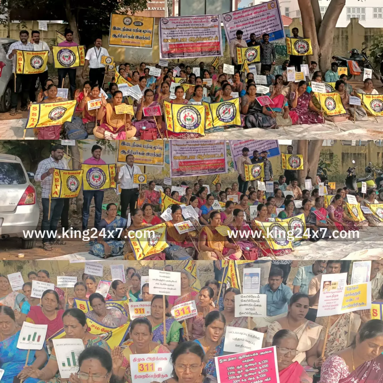 சமவேலைக்கு சமஊதியம் வழங்க கோரி கோஷங்கள் எழுப்பியும், திமுக தேர்தல் வாக்குறுதி 311 -ஐ நிறைவேற்றக்கோரிய அட்டைகளை ஏந்தியவாறும் இடைநிலை ஆசிரியர்கள் போராட்டத்தில் ஈடுபட்டனர்.;