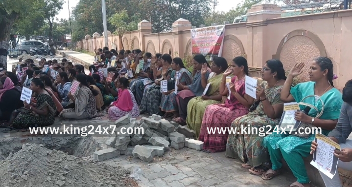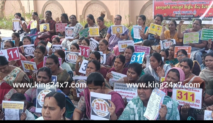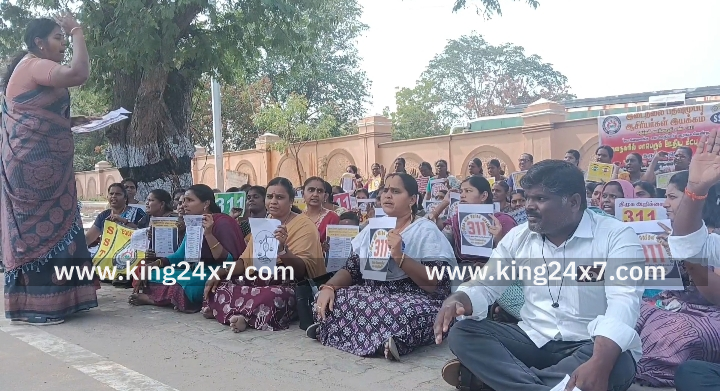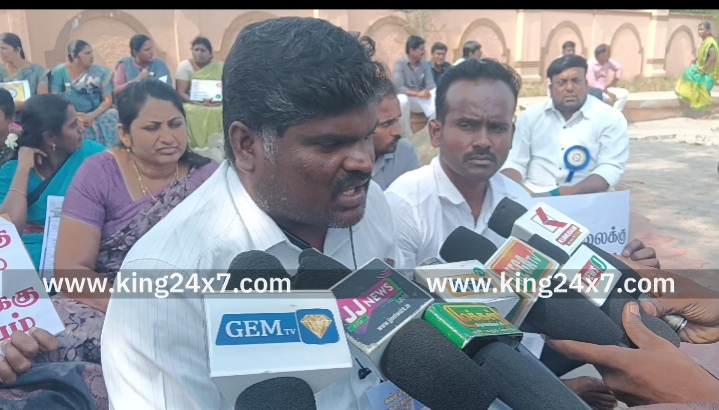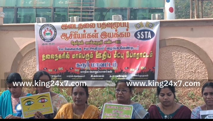 கரூரில் தமிழக அரசு அளித்த தேர்தல் வாக்குறுதி படி சம வேலைக்கு சம ஊதியம் வழங்க வலியுறுத்தி இடைநிலை பதிவு மூப்பு ஆசிரியர்கள் சாலையில் அமர்ந்து போராட்டம். கடந்த சட்டமன்றத் தேர்தலில் தற்போதைய திமுக அரசு இடைநிலை பதிவு ஒப்பு ஆசிரியர்களுக்கு சம வேலைக்கு சம ஊதியம் வழங்கப்படும் என உறுதி அளித்திருந்தது. ஆனால் சொன்னபடி தமிழக அரசு இடைநிலை பதிவு மூப்பு ஆசிரியர்களுக்கு சமஊதியம் வழங்கவில்லை. இதற்க்காக போராட்டங்கள் நடத்தியும் அரசு செவி சாய்க்காததால் இன்று தமிழக முழுவதும் மாவட்ட தலைநகரங்களில் போராட்டத்தில் ஈடுபட்டனர். இதன் தொடர்ச்சியாக கரூர் வட்டார போக்குவரத்து அலுவலகம் முன்பு சங்கத்தின் மாவட்ட துணைத் தலைவர் சங்கரேஸ்வரி தலைமையில் ஆர்ப்பாட்டத்தில் ஈடுபட்டனர். இந்த ஆர்ப்பாட்டத்தில் கரூர் வட்டார செயலாளர் ஷாலினி, கடவூர் வட்டார செயலாளர் சுரேஷ், அரவக்குறிச்சி வட்டார செயலாளர் செல்வராஜ் உள்ளிட்ட சங்க நிர்வாகிகள் உறுப்பினர்கள் சுமார் நூற்றுக்கும் மேற்பட்டோர் கலந்து கொண்டு தங்களது கோரிக்கைகளை வலியுறுத்தி போராட்டத்தில் ஈடுபட்டனர். இது குறித்து அரவக்குறிச்சி வட்டார செயலாளர் செல்வராஜ் செய்தியாளர்களிடம் தெரிவிக்கும் போது, தமிழகத்தில் கடந்த 2009 ஆம் ஆண்டுக்கு முன்பு வழங்கிய ஊதியத்திற்கும் 2009 ஆம் ஆண்டுக்குப் பின் நியமிக்கப்பட்ட இடைநிலை ஆசிரியர்களுக்கு வழங்கப்பட்ட ஊதியத்தில் ரூபாய் 3170 குறைவாக உள்ளது. கடந்த 16 ஆண்டுகளாக இதற்காக நாங்கள் போராடி வருகிறோம். ஊதியம் முரண்பாடுகளை களைவதற்காக 2023 ஆம் ஆண்டு போராட்டத்தில் ஈடுபட்ட போது தமிழக முதல்வர் மூன்று நபர் கொண்ட குழுவை அமைத்து மூன்று மாதத்தில் ஊதியம் உயர்த்தி வழங்குவதாக கூறியும் வழங்கவில்லை. இதனால் இன்று தமிழகம் முழுவதும் மாவட்ட தலைநகரங்களில் தரையில் அமர்ந்து போராட்டத்தில் ஈடுபட்டு வருவதாக தெரிவித்தார். எங்கள் சங்கத்தினரை அழைத்துப் பேசாவிட்டால் போராட்டங்கள் தீவிரமாகுமே தவிர பிரச்சனைக்கு தீர்வாகாது என தெரிவித்தார். .