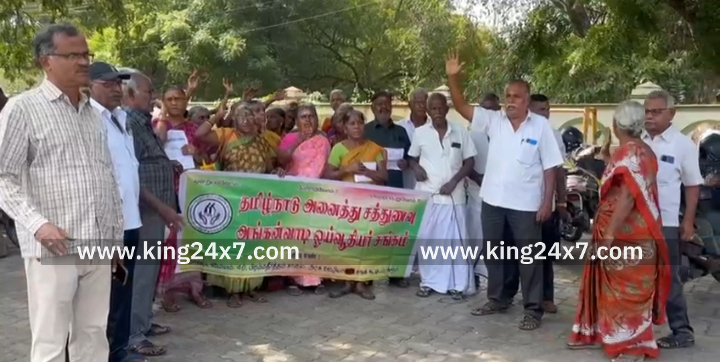கரூரில் தமிழ்நாடு அனைத்து சத்துணவு அங்கன்வாடி ஓய்வூதிய சங்கம் சார்பில் கோரிக்கை விளக்க ஆர்ப்பாட்டம் நடைபெற்றது.