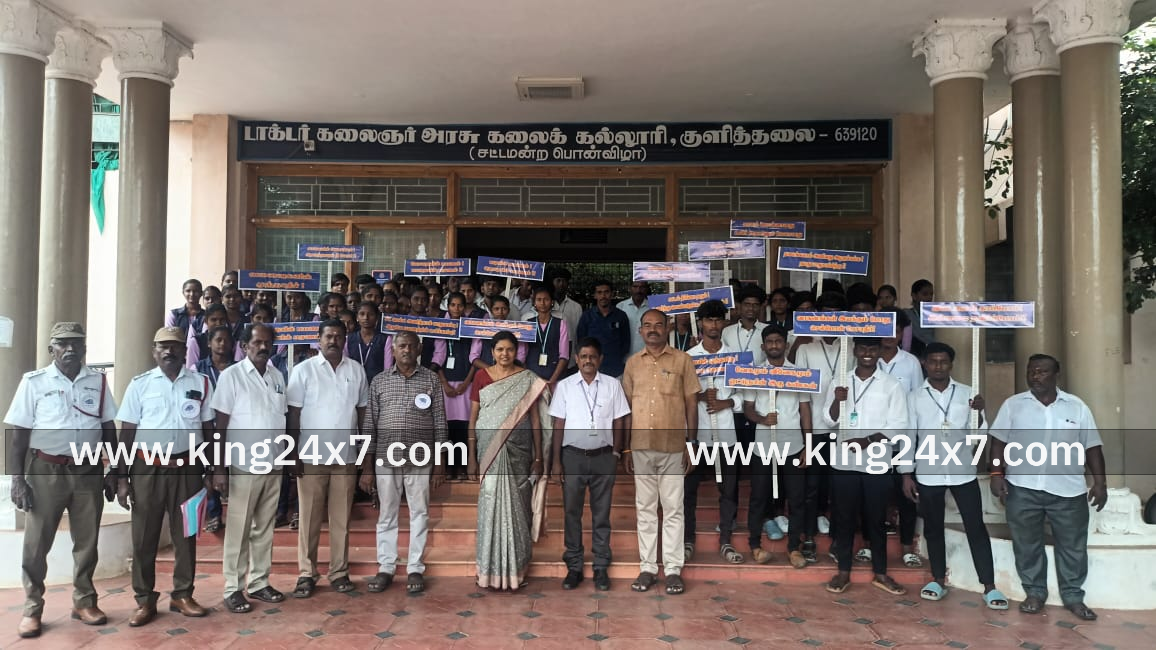 கரூர் மாவட்டம் குளித்தலை டாக்டர் கலைஞர் அரசு கலைக்கல்லூரியில் தமிழ்நாடு அரசு போக்குவரத்து கழகம் சார்பில் சாலை பாதுகாப்பு மாத விழா கல்லூரி முதல்வர் முனைவர் சுஜாதா தலைமையில் குளித்தலை அரசு போக்குவரத்து கழக கிளை சார்பில் சாலை போக்குவரத்து விழிப்புணர்வு வாகனம் கல்லூரிக்கு எடுத்துவரப்பட்டு முன்னோர்கள் மத்தியில் சாலை போக்குவரத்து விதிமுறைகள் மற்றும் போக்குவரத்து சிக்னல்கள் குறித்து விழிப்புணர்வு வழங்கப்பட்டது. இதில் குளித்தலை அரசு போக்குவரத்து கழக கிளை மேலாளர் ரமேஷ் நடத்துனர் கிருஷ்ணன், தொழில்நுட்ப பிரிவு அலுவலர் ராமமூர்த்தி, ஓட்டுநர் போதகர் சௌந்தர்ராஜ், ராஜேந்திரன் ஆகியோர் கலந்து கொண்டு மாணவர்களுக்கு போக்குவரத்து விழிப்புணர்வு தொடர்பான கருத்துக்களை விளக்கி கூறினார்கள். சீரான போக்குவரத்திற்கு மாணவ மாணவிகளின் ஒத்துழைப்பு மற்றும் சாலை விதிகளை மீறினால் ஏற்படக்கூடிய ஆபத்துகள் ஆகியன குறித்த விளக்கப்படங்கள் விளக்க உரைகள் எடுத்து கூறப்பட்டது. இதனை அடுத்து சாலை பாதுகாப்பு பதாகைகள் மாணவ, மாணவியர் கையில் ஏந்தும் விழிப்புணர்வு நிகழ்வும் நடத்தப்பட்டது. இதனை அடுத்து விழிப்புணர்வு பேருந்து மூலம் சாலை விழிப்புணர்வு கண்காட்சியும் மாணவர்களுக்கு காண்பிக்கப்பட்டது. இந்நிகழ்ச்சிக்கான ஏற்பாட்டினை உடற்கல்வி இயக்குனர் பொறுப்பு பேராசிரியர் வைரமூர்த்தி, நாட்டு நலப்பணி திட்ட ஒருங்கிணைப்பு அலுவலர் பேராசிரியர் பாபுநாத் ஆகியோர் செய்தனர்.