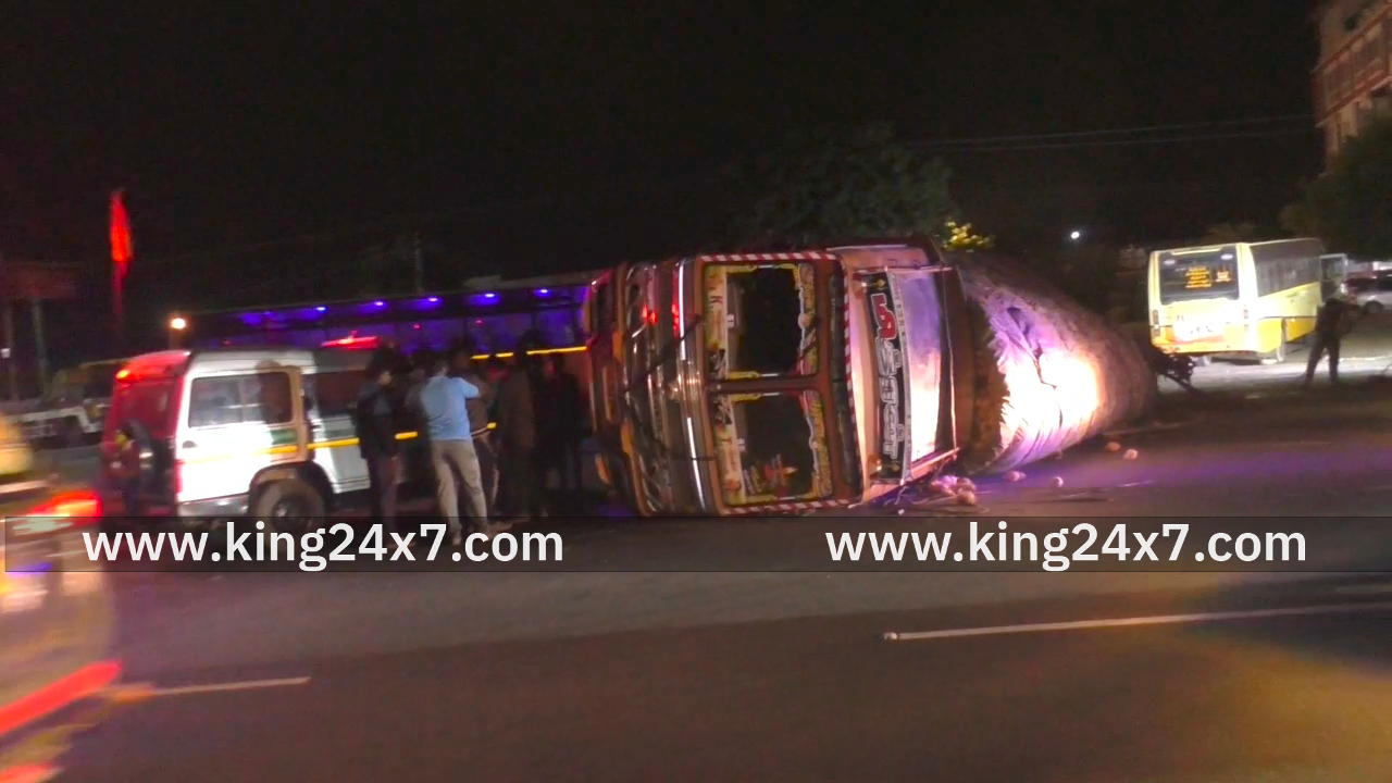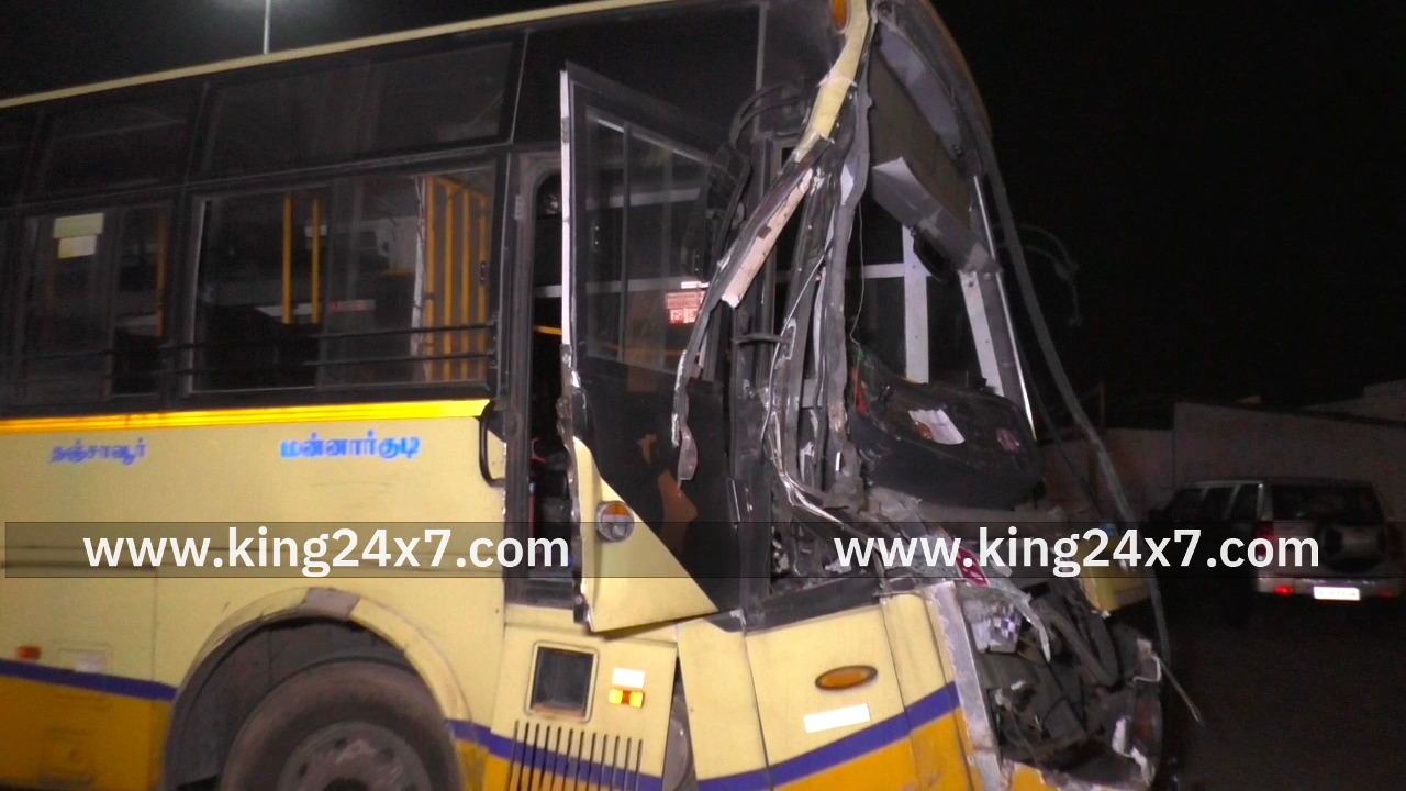 தஞ்சாவூர் மாவட்டம் பேராவூராணியில் இருந்து தேங்காய் லோடு ஏற்றிக் கொண்டு லாரி ஒன்று பொள்ளாச்சி நோக்கி சென்று கொண்டிருந்தது. அந்த லாரி நள்ளிரவு 1 மணியளவில் திருச்சி - திண்டுக்கல் தேசிய நெடுஞ்சாலையில் மணப்பாறையை அடுத்த நொச்சிமேடு என்ற இடத்தில் சென்றபோது திடீரென ஓட்டுனர் லாரியை திருப்ப முயன்றதாக கூறப்படும் நிலையில் பின்னால் மன்னார்குடியில் இருந்து கம்பம் நோக்கி 38 பயணிகளுடன் சென்ற அரசு பேருந்து லாரியின் பின்பகுதியில் மோதியதில் லாரி சாலையின் நடுவே கவிழ்ந்து விபத்துக்குள்ளானது. இந்த விபத்தில் பேருந்தின் முன்பகுதி சேதமடைத்துடன் இடிபாடுகளுக்குள் பேருந்து ஓட்டுனர் சிக்கிக் கொண்டார். இதையடுத்து சம்பவம் பற்றி தகவல் அறிந்த மணப்பாறை தீயணைப்பு துறையினர் சம்பவ இடத்திற்கு சென்று ஓட்டுனரை மீட்டு சிகிச்சைக்காக மருத்துவமனைக்கு அனுப்பிவைத்தனர். இந்நிலையில் லாரி சாலையில் கவிழ்ந்து அதிலிருந்த தேங்காயும் சாலையில் சிதறிக் கிடந்தது. இதையடுத்து மணப்பாறை நகராட்சி தூய்மை பணியாளார்கள் உடனடியாக களத்தில் இறங்கி சாலையில் உடைந்து சிதறிக் கிடந்த கண்ணாடி உள்ளிட்ட பொருட்களை அகற்றிய தோடு சாலையில் உடைந்து கிடந்த தேங்காயும் அப்புறப்படுத்தினர். இதே போல் மணப்பாறை போலீசார் சம்பவ இடத்திற்கு சென்று போக்குவரத்தை சரி செய்யும் பணியில் ஈடுப்பட்டனர். இவ்விபத்தில் பேருந்தின் ஓட்டுனர் தேனி மாவட்டம், ஆண்டிப்பட்டி, வரதராஜபுரத்தைச் சுரேஷ் (வயது 48) காயமடைந்த நிலையில் பேருந்தில் வந்த பயணிகள் ஒருசிலர் மட்டும் அதிஷ்டவசமாக சிறிய காயங்களுடன் உயிர் தப்பினர். பயணிகள் அனைவரையும் போலீசார் அந்த வழியாக வந்த வேறு பேருந்துகளில் அனுப்பி வைத்தனர். சம்பவம் தொடர்பாக மணப்பாறை போலீசார் வழக்கு பதிவு செய்து தப்பியோடிய லாரி ஓட்டுனரை தேடி வருகின்றனர். நள்ளிரவு நேரத்தில் நடைபெற்ற விபத்தால் அப்பகுதியில் சிறிது நேரம் போக்குவரத்து பாதிப்பு ஏற்பட்டது.