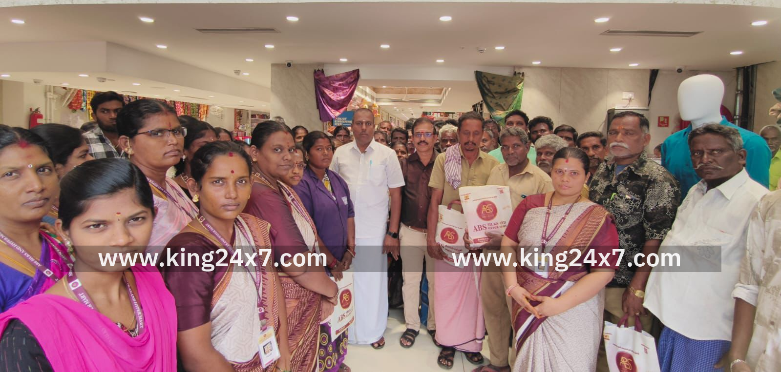 கரூர் மாவட்டம் குளித்தலை நகராட்சி அலுவலகம் கட்டிடம் அருகே உள்ள கட்டிடத்தில் பிரபலமான ஏபிஎஸ் சில்க்ஸ் அண்டு ஹைப்பர் மார்ட் நிறுவனம் புதிதாக கடந்த ஆண்டு தொடங்கப்பட்டது. அதன் உரிமையாளர் சீனிவாசன் என்பவர் இன்று குளித்தலை நகராட்சி அலுவலகத்தில் பணிபுரியும் தூய்மை பணியாளர்கள் மற்றும் டெங்கு ஒழிப்பு பணியாளர்கள் என மொத்தம் 102 நபர்களை தங்களது கடைக்கு வரவழைத்து பொங்கல் திருநாளை முன்னிட்டு ஆண்களுக்கு வேட்டி துண்டு மற்றும் பெண்களுக்கு சேலைகளை பொங்கல் பரிசாக வழங்கியுள்ளார். மேலும் நகராட்சியில் பணிபுரியும் தூய்மை பணியாளர்களுக்கு ஜவுளிகள் வாங்குவதில் 5% தள்ளுபடி கூப்பன்களும் வழங்கி பொங்கல் வாழ்த்துகளை தெரிவித்துக் கொண்டார்.