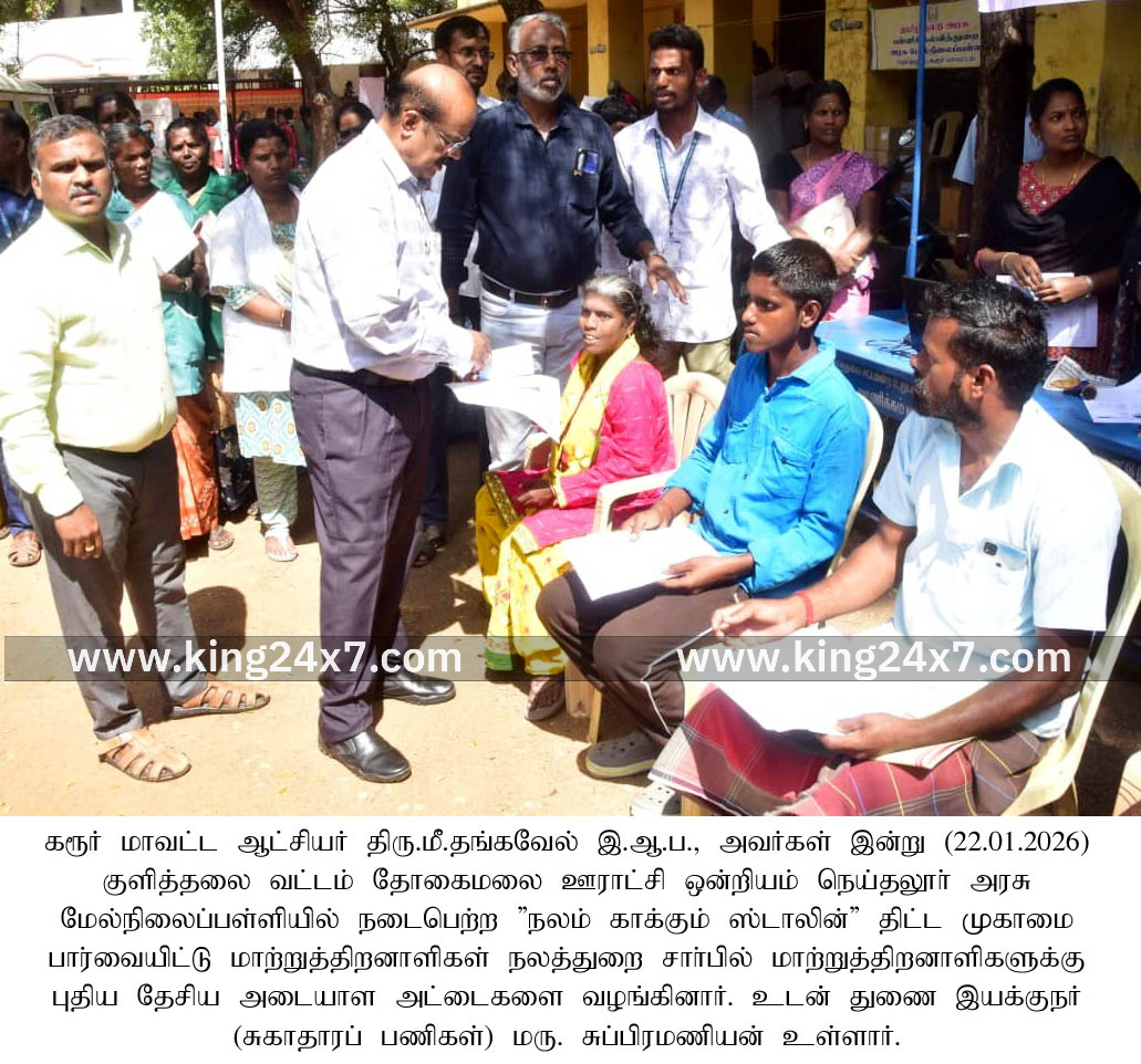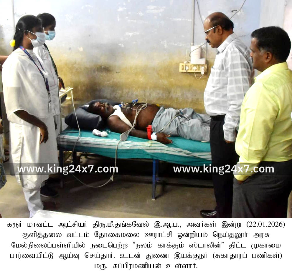 கரூர் மாவட்டம் குளித்தலை அருகே நெய்தலூர் அரசு மேல்நிலைப் பள்ளியில் நலம் காக்கும் ஸ்டாலின் திட்ட முகாம் இன்று நடைபெற்றது. மாவட்ட ஆட்சியர் தங்கவேல் கலந்து கொண்டு முகாமை பார்வையிட்டு ஆய்வு மேற்கொண்டார். இதில் 17 வகையான சிறப்பு மருத்துவர் சிகிச்சைகளும் முதல்வரின் விரிவான காப்பீடு திட்ட அட்டை மற்றும் மாற்றுத்திறனாளிகளுக்கான சான்றிதழ்கள் வழங்கப்பட்டது. இந்நிகழ்வில் துணை இயக்குனர் சுப்பிரமணியன், முன்னாள் தோகைமலை யூனியன் சேர்மன் சுகந்தி சசிகுமார், மற்றும் தொடர்புடைய அரசு அலுவலர்கள் கலந்து கொண்டனர்.